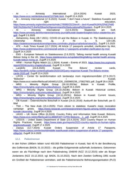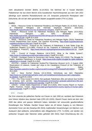 - AI – Amnesty International (23.4.2024): Kuwait 2023, https://www.ecoi.net/de/dokument/2107946.html, Zugriff 22.4.2025 - AI – Amnesty International (17.8.2023): Kuwait: “I don’t have a future”: Stateless Kuwaitis and the right to education, https://www.amnesty.org/en/documents/mde17/6990/2023/en/#:~:text=Kuwait%3A%20%E2%80 %9CI%20don%27t,the%20free%20government%20educational%20system, Zugriff 24.4.2025 - AI – Amnesty International (12.6.2023): Staatenlos am Golf, https://www.amnesty.de/informieren/amnesty-journal/kuwait-staatenlosigkeit-bidun-staatenlos-am- golf, Zugriff 2.5.2025 - Alshammiry, Areej (28.7.2021): COVID-19 and the Bidoon in Kuwait, in: The Statelessness & Citizenship Review, Jg. 3 Nr. 1, S. 123-130, https://statelessnessandcitizenshipreview.com/index.php/journal/article/view/301, Zugriff 2.5.2025 - ATK – Arab Times Kuwait (13.7.2024): All Article 17 passports annulled, clarification by MoI, https://www.arabtimesonline.com/news/all-article-17-passports-annulled-clarification-by-moi/, Zugriff 24.4.2025 - ENS – European Network on Statelessness (2.6.2023): Talking mental health among Kuwaiti Bidoon living in the UK, https://www.statelessness.eu/updates/blog/talking-mental-health-among- kuwaiti-bidoon-living-uk, Zugriff 2.5.2025 - HRW – Human Rights Watch (11.1.2024): Kuwait – Events of 2023, https://www.hrw.org/world- report/2024/country-chapters/kuwait, Zugriff 22.4.2025 - Landinfo (24.8.2020): Kuwait: The Biduns’ review cards, https://landinfo.no/wp-content/uploads/2020/10/Query-response-Kuwait-The-Biduns-review- cards-2020.pdf, Zugriff 23.4.2025 - LIFOS – Center för landinformation och landanalys inom migrationsområdet (27.6.2017): “Bidooner” i Kuwait, https://www.ecoi.net/en/file/local/1404451/1226_1500965236_170627601.pdf, Zugriff 29.4.2025 - MRG – Minority Rights Group (16.10.2023a): Bidoon in Kuwait: Profile, https://minorityrights.org/communities/bidoon/, Zugriff 24.4.2025 - MRG – Minority Rights Group (16.10.2023b): Bidoon in Kuwait: Historical context, https://minorityrights.org/communities/bidoon/, Zugriff 24.4.2025 - MRG – Minority Rights Group (16.10.2023c): Bidoon in Kuwait: Current Issues, https://minorityrights.org/communities/bidoon/, Zugriff 23.4.2025 - ÖB Kuwait – Österreichische Botschaft in Kuwait (24.01.2018): Auskunft der Botschaft, per E- Mail - TNA – The New Arab (15.4.2025): From citizen to stateless: Kuwait's mass revocation campaign grows, https://www.newarab.com/news/prominent-figures-among-42000-stripped- kuwaiti-citizenship, Zugriff 24.4.2025 - UKHO – UK Home Office (8.2024): Country Policy and Information Note Kuwait: Bidoons, https://www.ecoi.net/en/file/local/2113868/KWT+CPIN+Bidoons__1_.pdf, Zugriff 24.4.2025 - USDOS – United States Department of State (23.4.2024): 2023 Country Report on Human Rights Practices: Kuwait, https://www.state.gov/reports/2023-country-reports-on-human-rights- practices/kuwait/, Zugriff 17.4.2025 - Zawiya (12.7.2024): Kuwait Orders Suspension of Article 17 Passports, https://www.zawya.com/en/world/middle-east/kuwait-orders-suspension-of-article-17-passports- e5lqx3vl, Zugriff 24.4.2025 12.2. Palästinenser In den frühen 1990ern lebten rund 450.000 Palästinenser in Kuwait, fast 45 % der Bevölkerung des Golfemirats (BADIL 31.10.2022) – die größte Exilgemeinde außerhalb Jordaniens. Gekommen waren sie als Flüchtlinge nach dem Palästinakrieg 1948/49 (NZZ 15.12.2015) oder als Bürger Jordaniens (NZZ 15.12.2015; vgl. BADIL 31.10.2022). Nach dem Zweiten Golfkrieg 1991 wurde ein Großteil der Palästinenser vertrieben, weil die Palästinensische Befreiungsorganisation (PLO) .BFA Bundesamt für Fremdenwesen und Asyl Seite 24 von 36