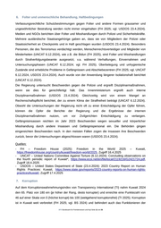 6. Folter und unmenschliche Behandlung, Haftbedingungen Verfassungsrechtliche Schutzbestimmungen gegen Folter und andere Formen grausamer und ungewöhnlicher Bestrafung werden nicht immer eingehalten (FH 2025; vgl. USDOS 23.4.2024). Medien und NGOs berichten über Folter und Misshandlungen durch Polizei und Sicherheitskräfte. Mehrere ausländische Staatsangehörige gaben an, dass sie von Mitgliedern der Polizei oder Staatssicherheit an Checkpoints und in Haft geschlagen wurden (USDOS 23.4.2024). Besonders Personen, die des Terrorismus verdächtigt werden, Menschenrechtsverteidiger und Mitglieder von Minderheiten (UNCAT 6.12.2024), wie z.B. die Bidun (FH 2025), sind Folter und Misshandlungen durch Strafverfolgungsbeamte ausgesetzt, v.a. während Verhaftungen, Einvernahmen und Untersuchungsphasen (UNCAT 6.12.2024; vgl. FH 2025). Überbelegung und unhygienische Zustände sind erhebliche Probleme in Gefängnissen und Abschiebezentren (FH 2025; vgl. UNCAT 6.12.2024, USDOS 23.4.2024). Auch wurde von der Anwendung längerer Isolationshaft berichtet (UNCAT 6.12.2024). Die Regierung untersucht Beschwerden gegen die Polizei und ergreift Disziplinarmaßnahmen, wenn sie dies für gerechtfertigt hält. Das Innenministerium ergreift auch interne Disziplinarmaßnahmen (USDOS 23.4.2024). Gleichzeitig wird von einem Mangel an Rechenschaftspflicht berichtet, der zu einem Klima der Straffreiheit beiträgt (UNCAT 6.12.2024). Obwohl die Untersuchungen der Regierung nicht oft zu einer Entschädigung der Opfer führen, können die Opfer die Berichte der Regierung und die Ergebnisse der internen Disziplinarmaßnahmen nutzen, um vor Zivilgerichten Entschädigung zu verlangen. Gefängnisinsassen reichten im Jahr 2023 Beschwerden wegen sexueller und körperlicher Misshandlung durch andere Insassen und Gefängnispersonal ein. Die Behörden gingen eingereichten Beschwerden nach. In den meisten Fällen zogen die Insassen ihre Beschwerden zurück, bevor die Untersuchungen abgeschlossen waren (USDOS 23.4.2024). Quellen: - FH – Freedom House (2025): Freedom in the World 2025 – Kuwait, https://freedomhouse.org/country/kuwait/freedom-world/2025, Zugriff 16.4.2025 - UNCAT – United Nations Committee Against Torture (6.12.2024): Concluding observations on the fourth periodic report of Kuwait*, https://www.ecoi.net/en/file/local/2119216/G2421724.pdf, Zugriff 18.4.2025 - USDOS – United States Department of State (23.4.2024): 2023 Country Report on Human Rights Practices: Kuwait, https://www.state.gov/reports/2023-country-reports-on-human-rights- practices/kuwait/, Zugriff 17.4.2025 7. Korruption Auf dem Korruptionswahrnehmungsindex von Transparency International (TI) nahm Kuwait 2024 den 65. Platz von 180 ein (je höher der Rang, desto korrupter) und erreichte eine Punktezahl von 46 auf einer Skala von 0 (höchst korrupt) bis 100 (weitgehend korruptionsfrei) (TI 2025). Korruption ist in Kuwait weit verbreitet (FH 2025; vgl. BS 2024) und behindert auch das Funktionieren der .BFA Bundesamt für Fremdenwesen und Asyl Seite 11 von 36