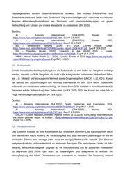 Hausangestellten werden Gewerkschaftsrechte verwehrt. Die meisten Arbeitnehmer sind Staatsbedienstete und haben kein Streikrecht. Migranten beteiligen sich manchmal an riskanten illegalen Arbeitskampfmaßnahmen wie Sitzstreiks und Arbeitsniederlegungen, um gegen Nichtzahlung von Löhnen und andere Missstände zu protestieren (FH 2025). Quellen: - AI – Amnesty International (29.4.2025): Kuwait 2024, https://www.ecoi.net/de/dokument/2124737.html, Zugriff 2.5.2025 - AI – Amnesty International (23.4.2024): Kuwait 2023, https://www.ecoi.net/de/dokument/2107946.html, Zugriff 22.4.2025 - BS – Bertelsmann Stiftung (2024): BTI 2024 Country Report Kuwait, https://www.ecoi.net/en/file/local/2105906/country_report_2024_KWT.pdf, Zugriff 16.4.2025 - FH – Freedom House (2025): Freedom in the World 2025 – Kuwait, https://freedomhouse.org/country/kuwait/freedom-world/2025, Zugriff 16.4.2025 - HRW – Human Rights Watch (11.1.2024): Kuwait – Events of 2023, https://www.hrw.org/world- report/2024/country-chapters/kuwait, Zugriff 22.4.2025 10. Todesstrafe Gemäß kuwaitischer Rechtsprechung kann die Todesstrafe für eine Reihe von Vergehen verhängt werden, darunter auch für Vergehen, die nicht in die Kategorie der „schwersten Verbrechen“ fallen, wie z.B. Meineid und erzwungener Meineid sowie Drogenvergehen (UNCAT 6.12.2024). Kuwait hat gemäß den Aufzeichnungen von Amnesty International im Jahr 2024 sechs Todesurteile vollstreckt und mindestens sieben verhängt. Mit Stand Ende 2024 warteten in Kuwait zumindest 32 Personen auf die Vollstreckung ihres Todesurteils (AI 8.4.2025). 2024 hat Kuwait das dritte Jahr in Folge Hinrichtungen durchgeführt (AI 29.4.2025). Quellen: - AI – Amnesty International (8.4.2025): Death Sentences and Executions 2024, https://www.amnesty.org/en/documents/act50/8976/2025/en/, Zugriff 18.4.2025 - AI – Amnesty International (29.4.2025): Kuwait 2024, https://www.ecoi.net/de/dokument/2124737.html, Zugriff 2.5.2025 - UNCAT – United Nations Committee Against Torture (6.12.2024): Concluding observations on the fourth periodic report of Kuwait*, https://www.ecoi.net/en/file/local/2119216/G2421724.pdf, Zugriff 18.4.2025 11. Religionsfreiheit Das Zivilrecht Kuwaits ist eine Kombination aus britischem Common Law, französischem Recht und islamischem Recht. Artikel 2 der Verfassung legt fest, dass der Islam Staatsreligion ist und die islamische Scharia eine wichtige (aber nicht die einzige) Rechtsquelle darstellt. Der Staat ist weitgehend säkular und orientiert sich an modernen Prinzipien. Die herrschende Familie ist dafür bekannt, den Einfluss religiöser Dogmen auf die Rechtsordnung und die politischen Institutionen zu begrenzen (BS 2024). Der Islam ist Staatsreligion, und Blasphemie ist strafbar. Die Verunglimpfung des Islam, Christentums und Judentums ist verboten. Die Regierung ernennt .BFA Bundesamt für Fremdenwesen und Asyl Seite 15 von 36