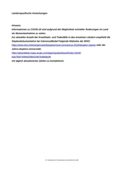 Länderspezifische Anmerkungen Hinweis: Informationen zu COVID-19 sind aufgrund der Möglichkeit schneller Änderungen im Land als Momentaufnahme zu sehen. Zur aktuellen Anzahl der Krankheits- und Todesfälle in den einzelnen Ländern empfiehlt die Staatendokumentation bei Interesse/Bedarf folgende Websites der WHO: https://www.who.int/emergencies/diseases/novel-coronavirus-2019/situation-reports oder der Johns-Hopkins-Universität: https://gisanddata.maps.arcgis.com/apps/opsdashboard/index.html#/ bda7594740fd40299423467b48e9ecf6 mit täglich aktualisierten Zahlen zu kontaktieren. .BFA Bundesamt für Fremdenwesen und Asyl Seite 3 von 34