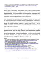 -USDOS – US Department of State [USA] (12.4.2022): 2021 Country Report on Human Rights Practices: Malaysia, https://www.state.gov/reports/2021-country-reports-on-human-rights- practices/malaysia/, Zugriff 11.7.2022 14. Todesstrafe Malaysia erlaubt die Todesstrafe für mehrere Straftaten, wobei sie bei 11 Vergehen verpflichtend ist (HRW 13.1.2022). Beispiele für ebenjene Vergehen sind u.a. Mord, Terrorismus oder Majestätsbeleidigung. 2018 wurde allerdings ein Hinrichtungsstopp verabschiedet (DFAT 29.6.2021, S. 54). Außerdem kündigte Malaysias Regierung Zeitungsberichten zufolge an, die verpflichtende Todesstrafe komplett abschaffen zu wollen (CNN 10.6.2022). Wenn die Todesstrafe vom Obersten Gerichtshof verhängt wurde, geschieht eine Prüfung durch ein Berufungsgericht automatisch. Es besteht außerdem die Möglichkeit eines Gnadengesuchs. Vor der Durchführung der Todesstrafe, welche vornehmlich durch Erhängen vollstreckt wird, befinden sich Verurteilte üblicherweise einige Jahre im Todestrakt (DFAT 29.6.2021, S. 54). Ca. 1300 Personen befinden sich derzeit in einem malaysischen Todestrakt, die meisten von ihnen wegen Drogenhandels (FH 28.2.2022). Die beiden Bundesstaaten Kelantan und Terengganu erlauben per Landesrecht die Todesstrafe für Apostasie vom Islam, obwohl dies gegen Bundesrecht verstößt. Nichtsdestotrotz wurde eine Todesstrafe dafür noch von keinem Gericht verhängt, womit eine etwaige Rechtsmäßigkeit eines solchen Urteils bis dato in der Praxis noch nicht geprüft wurde (USDOS 2.6.2022). 2018 urteilte der Oberste Gerichtshof, dass Fälle der Apostasie, die den Islam betreffen, im Zuständigkeitsbereich der Schariagerichte liegen (DFAT 29.6.2021, S. 31). Quellen: -CNN – Cable News Network (10.6.2022): Malaysia to abolish mandatory death penalty in move welcomed by rights campaigners, https://edition.cnn.com/2022/06/10/asia/malaysia-death- penalty-abolish-human-rights-intl-hnk/index.html, Zugriff 7.7.2022 -DFAT – Department of Foreign Affairs and Trade [Australien] (29.6.2021): DFAT Country Information Report Malaysia, https://www.ecoi.net/en/file/local/2057577/malaysia-dfat-country- information-report-29-june-2021.pdf, Zugriff 7.7.2022 -FH – Freedom House (28.2.2022): Freedom in the World 2022 – Malaysia, https://freedomhouse.org/country/malaysia/freedom-world/2022, Zugriff 7.7.2022 -HRW – Human Rights Watch (13.1.2022): World Report 2022 – Malaysia, https://www.hrw.org/world-report/2022/country-chapters/malaysia#df0e58, Zugriff 7.7.2022 -USDOS – US Department of State [USA] (2.6.2022): 2021 Report on International Religious Freedom: Malaysia, https://www.state.gov/reports/2021-report-on-international-religious- freedom/malaysia/, Zugriff 7.7.2022 .BFA Bundesamt für Fremdenwesen und Asyl Seite 21 von 34