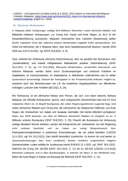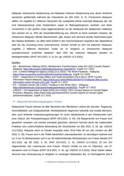 -USDOS – US Department of State [USA] (2.6.2022): 2021 Report on International Religious Freedom: Malaysia, https://www.state.gov/reports/2021-report-on-international-religious- freedom/malaysia/, Zugriff 11.7.2022 16. Ethnische Minderheiten In Malaysia leben Schätzungen zufolge 33,9 Millionen Menschen, wobei ethnische Malaien und Mitglieder indigener Volksgruppen, u.a. Orang Asli, Dayak und Anak Negeri, ca. 62,5 % der Gesamtbevölkerung ausmachen. Malaysier chinesischer bzw. indischer Abstammung stellen 20,6% respektive 6,2% dar, während weitere Minderheiten ungefähr 0,9% repräsentieren. Der Anteil von Menschen, die in Malaysia leben, aber keine Staatsbürgerschaft besitzen, machte 2019 9,8% aus (CIA 21.6.2022, vgl. DFAT 29.6.2021, S. 9). Zwar verbietet die Verfassung ethnische Diskriminierung, aber sie gewährt den Bumiputera eine „Sonderstellung“ und erlaubt infolgedessen Maßnahmen positiver Diskriminierung (DFAT 29.6.2021, S. 20, vgl. FH 28.2.2022). Ethnische Minderheiten, vornehmlich chinesische und indische Malaysier, werden daher durch Quotenregelungen und exklusive Praktiken im Staatsleben, im Hochschulwesen, im Staatsdienst, in öffentlichen Unternehmen und im Militär systematisch benachteiligt. Obwohl die Partizipation in der Privatwirtschaft einfacher möglich ist, existieren auch hier Behinderungen wie z.B. die staatlichen Vergabepraktiken von öffentlichen Aufträgen, Lizenzen oder Krediten (BS 2022, S. 26). Per Verfassung ist ein ethnischer Malaie eine Person, die sich zum Islam bekennt, Bahasa Malaysia, die offizielle Amtssprache, spricht, nach malaysisches Gewohnheiten lebt und ein Kind malaischer Eltern ist. Im Begriff Bumiputera, der vielen Regierungsreformen zugrunde liegt, sind neben ethnischen Malaien auch Orang Asli, die Ureinwohner der Malaiischen Halbinsel, und Anak Negeri, die Ureinwohner von Sabah und Sarawak, beinhaltet. Die letzten öffentlich verfügbaren Daten aus 2015 sprechen von über 14 Millionen ethnischen Malaien im Vergleich zu ca. 3 Millionen anderen Bumiputera (DFAT 29.6.2021, S. 20). Obwohl alle Bumiputera der Verfassung zufolge dieselben Rechte besitzen, werden die Bürgerrechte der Ureinwohner von der Regierung nicht wirksam beschützt und sie haben nur wenig Mitspracherecht bzw. Partizipationsmöglichkeiten in politischen Entscheidungen, die sie selbst betreffen (USDOS 12.4.2022, vgl. FH 28.2.2022), Dies betrifft besonders Landrechte. Es kommt hin und wieder zu Auseinandersetzungen über ihren Landbesitz, dessen rechtliche Ungewissheit indigene Gemeinschaften zudem anfällig für Ausbeutung macht (USDOS 12.4.2022, vgl. DFAT 29.6.2021). Während die Orang Asli 150.000 (DFAT 29.6.2021, S. 21) bis zu 200.000 (USDOS 12.4.2022) Menschen umfassen und in allen Bundesstaaten, in welchen sie leben, in der Minderheit sind, bilden die Anak Negeri in Sabah und Sarawak die Mehrheit (DFAT 29.6.2021, S. 21). .BFA Bundesamt für Fremdenwesen und Asyl Seite 24 von 34