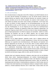 -FH – Freedom House (28.2.2022): Freedom in the World 2022 – Malaysia, https://freedomhouse.org/country/malaysia/freedom-world/2022, Zugriff 12.7.2022 -USDOS – US Department of State [USA] (12.4.2022): 2021 Country Report on Human Rights Practices: Malaysia, https://www.state.gov/reports/2021-country-reports-on-human-rights- practices/malaysia/, Zugriff 12.7.2022 19. IDPs und Flüchtlinge Dem US Außenministerium zufolge gibt es keine IDPs in Malaysia. Laut UNHCR befanden sich am 31.12.2021 180.440 Flüchtlinge und Asylwerber im Land. Mit 155.400 Personen stammte die absolute Mehrheit aus Myanmar, wobei die Mehrheit Menschen der ethnischen Gruppen der Rohingya (103.380) und der Chin (22.570) darstellen. Die restlichen 24.040 Individuen kamen unter anderem aus Pakistan, dem Jemen, Syrien, Somalia, und Afghanistan. 46.170 waren unter 18 Jahre alt (USDOS 12.4.2022). Malaysia hat die UN-Flüchlingskonvention aus 1951 nicht ratifiziert (HRW 13.1.2022, vgl. DFAT 29.6.2021, S. 10). Das Gesetz sieht keine Gewährung von Asyl oder Flüchtlingsstatus vor und die Regierung hat kein System des Flüchtlingsschutzes errichtet. Migranten, Flüchtlinge und Staatenlose erhalten keine staatlichen Hilfeleistungen. Die malaysische Regierung erlaubt UNHCR und NGOs die Arbeit mit diesen Bevölkerungsgruppen, aber die Regierungskooperation mit UNHCR ist begrenzt und wechselhaft. (USDOS 12.4.2022). Flüchtlinge und Asylwerber sind zwar bei UNHCR registriert, aber sie besitzen keinen Rechtsstatus. Auch haben sie weder einen Zugang zum Arbeitsmarkt noch zu öffentlichen Schulen (HRW 13.1.2022). Menschen, die als „illegale Migranten“ angesehen werden, droht in Malaysia jederzeit die Abschiebung (USDOS 12.4.2022). So wurden beispielsweise im Februar 2021 trotz des dortigen Militärcoups und ungeachtet eines Gerichtsbeschlusses 1.086 Migranten und Asylwerber nach Myanmar abgeschoben (AI 29.3.2022, vgl. FH 28.2.2022, HRW 13.1.2022). Außerdem können diese „illegalen Migranten“ mit einer Haftstrafe von bis zu 5 Jahren, einer Geldstrafe, beidem und mit 6 verpflichtenden Stockschlägen bestraft werden, falls sie wegen Verletzungen der Einwanderungsgesetze verurteilt wurden. Mehrere tausende Personen werden von der Regierung in Abschiebehaftanstalten und weiteren Einrichtungen festgehalten (USDOS 12.4.2022). Zu diesen hat UNHCR seit 2019 keinen Zugang (HRW 13.1.2022, vgl. DFAT 29.6.2021, S. 61). Außerdem leben auch staatenlose Menschen in Malaysia, wobei diese nicht von den Behörden offiziell erfasst werden. Staatsbürgerschaftsgesetze und restriktive Geburtenregistrierungen erschufen eine nennenswerte Gruppe an staatenlosen Kindern unter Migranten und Flüchtlingen. Wenn Mütter keinen gültigen Staatsbürgerschaftsnachweis besitzen, geben die Behörden die Staatsbürgerschaft eines Kindes im Geburtszertifikat als unbekannt an. UNHCR schätzt, dass sich im Oktober 2021 9.040 Staatenlose auf der Malaiischen Halbinsel, vorwiegend Tamilen, befanden, während ca. 450.000 staatenlose Menschen 2019 in Sabah lebten. Genaue Zahlen sind nicht .BFA Bundesamt für Fremdenwesen und Asyl Seite 29 von 34