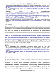 - AA - Auswärtiges Amt [Deutschland] (12.2.2024): Bericht über die asyl- und abschiebungsrelevante Lage in der Sozialistischen Republik Vietnam (Stand: November 2023), https://www.ecoi.net/en/file/local/2104342/Ausw%C3%A4rtiges_Amt%2C_Bericht_%C3%BCber_ die_asyl- _und_abschiebungsrelevante_Lage_in_der_Sozialistischen_Republik_Vietnam%2C_12.02.2024. pdf, Zugriff 8.8.2024 - Allianzcare (2024): Das Gesundheitssystem in Vietnam, https://www.allianzcare.com/de/ressourcen/gesundheit-und-wellness/national- healthcare-systems/gesundheitssystem-in-vietnam.html, Zugriff 27.8.2024 - IOM - Internationale Organisation für Migration (12.2022): Länderinformationsblatt Vietnam 2022 , https://milo.bamf.de/OTCS/cs.exe/fetchcsui/-26803252/Vietnam_%2D_Country_Fact_Sheets_20 22%2C_englisch.pdf?nodeid=24077930&vernum=-2 , Zugriff 2 1.8.2024 - USAID – United States Agency for International Development [USA] (7.2023): Vietnam. FactSheet Health, https://www.usaid.gov/sites/default/files/2023-07/OH-Sector_FS_July2023_Eng.pdf , Zugriff 27.8.2024 23. Rückkehr Die ungenehmigte Ausreise aus Vietnam und der unerlaubte Verbleib im Ausland stehen seit Inkrafttreten (01.01.2018) des neuen Strafgesetzbuches (2015) nur noch dann unter Strafe, wenn der Zweck von Ausreise und Auslandsaufenthalt die Bekämpfung der vietnamesischen Volksregierung ist. Die ungenehmigte Ausreise allein ist seither keine Straftat mehr (AA 12.2.2024). Sollten von Rückkehrenden vor der Ausreise aus Vietnam sonstige Straftaten begangen worden sein, muss – sofern keine Verjährung eingetreten ist – mit einer Strafverfolgung nach der Rückkehr gerechnet werden. Der Grundsatz ne bis in idem [nicht zweimal in derselben Sache] ist in Art. 31 Abs. 3 der Verfassung (2013), Art. 32 Abs. 3 Strafgesetzbuch (2015) und Art. 14 Strafverfahrensgesetz (2015) enthalten (AA 12.2.2024). Quellen: - AA - Auswärtiges Amt [Deutschland] (12.2.2024): Bericht über die asyl- und abschiebungsrelevante Lage in der Sozialistischen Republik Vietnam (Stand: November 2023), https://www.ecoi.net/en/file/local/2104342/Ausw%C3%A4rtiges_Amt%2C_Bericht_%C3%BCber_ die_asyl- _und_abschiebungsrelevante_Lage_in_der_Sozialistischen_Republik_Vietnam%2C_12.02.2024. pdf, Zugriff 8.8.2024 24. Dokumente Es ist verhältnismäßig einfach, in Vietnam echte, aber inhaltlich unwahre Urkunden und amtliche Bescheinigungen jeglicher Art oder entsprechende Blanko-Vordrucke gegen entsprechende Bezahlung zu erhalten. Nach vorliegenden Informationen können vietnamesische Blankodokumente (Haftbefehle, Fahndungsbefehle, Scheidungsurteile, Mitgliedsbescheinigungen) auch in Deutschland käuflich erworben werden. Seit Wiederöffnung des Landes für den Reiseverkehr im März 2022 steigen die Visumantragszahlen kontinuierlich an. Die Vorlage von .BFA Bundesamt für Fremdenwesen und Asyl Seite 35 von 36