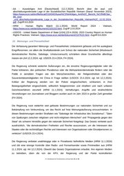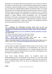 - AA - Auswärtiges Amt [Deutschland] (12.2.2024): Bericht über die asyl- und abschiebungsrelevante Lage in der Sozialistischen Republik Vietnam (Stand: November 2023), https://www.ecoi.net/en/file/local/2104342/Ausw%C3%A4rtiges_Amt%2C_Bericht_%C3%BCber_ die_asyl- _und_abschiebungsrelevante_Lage_in_der_Sozialistischen_Republik_Vietnam%2C_12.02.2024. pdf, Zugriff 8.8.2024 - HRW - Human Rights Watch (11.1.2024): World Report 2024 - Vietnam, https://www.ecoi.net/de/dokument/2103153.html, Zugriff 13.8.2024 - USDOS - United States Department of State [USA] (23.4.2024): 2023 Country Report on Human Rights Practices: Vietnam, https://www.ecoi.net/de/dokument/2107615.html, Zugriff 8.8.2024 12. Meinungs- und Pressefreiheit Die Verfassung garantiert Meinungs- und Pressefreiheit. Unbestimmt gefasste und frei auslegbare Eingriffsnormen, vor allem die Straftatbestände zum Schutz der nationalen Sicherheit (Missbrauch demokratischer Rechte, Sabotage, Umsturzversuch) schränken diese Grundrechte allerdings massiv ein (AA 12.2.2024; vgl. USDOS 23.4.2024, FH 2024). Die Regierung schränkt weiterhin Äußerungen ein, die einzelne Regierungsmitglieder oder die Partei kritisieren, den politischen Pluralismus oder die Mehrparteiendemokratie fördern oder die Politik in sensiblen Fragen wie den Menschenrechten, der Religionsfreiheit oder den Souveränitätsstreitigkeiten mit China in Frage stellten (USDOS 23.4.2024; vgl. AA 12.2.2024). Kritiker der Regierung werden von der Polizei eingeschüchtert, schikaniert, in ihrer Bewegungsfreiheit eingeschränkt, willkürlich festgenommen und inhaftiert und nach unfairen Gerichtsverfahren verurteilt (HRW 11.1.2024). Verhaftungen, Angriffe und strafrechtliche Verurteilungen von Journalisten und Bloggern wurden auch im Jahr 2023 in großer Zahl gemeldet (FH 2024). Die Regierung nutzt weiterhin weit gefasste Bestimmungen zur nationalen Sicherheit und zur Bekämpfung von Verleumdung, um das Recht auf freie Meinungsäußerung einzuschränken. In diesen Bestimmungen werden Straftaten wie "Sabotage der Infrastruktur des Sozialismus", "Säen von Spaltungen zwischen religiösen und nicht-religiösen Menschen" und "Propaganda gegen den Staat" als schwere Verstöße gegen die nationale Sicherheit festgelegt. Das Gesetz verbietet auch ausdrücklich, "die demokratischen Freiheiten und Rechte auszunutzen, um die Interessen des Staates oder die rechtmäßigen Rechte und Interessen von Organisationen oder Einzelpersonen zu verletzen" (USDOS 23.4.2024). Die Regierung verbietet unabhängige oder in Privatbesitz befindliche Medien (HRW 11.1.2024) und übt eine strenge Kontrolle über Radio- und Fernsehsender sowie Printmedien aus (HRW 11.1.2024; vgl. AA 12.2.2024). Obwohl das Gesetz Organisationen erlaubte, ihre eigenen Medien zu betreiben, üben die von der KPV, der Regierung und der Partei kontrollierten .BFA Bundesamt für Fremdenwesen und Asyl Seite 15 von 36