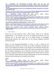 - AA - Auswärtiges Amt [Deutschland] (12.2.2024): Bericht über die asyl- und abschiebungsrelevante Lage in der Sozialistischen Republik Vietnam (Stand: November 2023), https://www.ecoi.net/en/file/local/2104342/Ausw%C3%A4rtiges_Amt%2C_Bericht_%C3%BCber_ die_asyl- _und_abschiebungsrelevante_Lage_in_der_Sozialistischen_Republik_Vietnam%2C_12.02.2024. pdf, Zugriff 8.8.2024 - AA.com.tr (22.5.2024): Vietnam elects To Lam as new president, https://www.aa.com.tr/en/asia- pacific/vietnam-elects-to-lam-as-new-president/3226536, Zugirff 29.8.2024 - BS - Bertelsmann Stiftung (2024): BTI 2022 Country Report Vietnam, https://bti-project.org/de/reports/country-report/VNM, Zugriff 8.8.2024 - Chatham House (9.5.2024): Vietnam’s political turmoil reveals a turn towards China - and away from the West, https://www.chathamhouse.org/2024/05/vietnams-political-turmoil-reveals-turn- towards-china-and-away-west, Zugriff 28.8.2024 - FH - Freedom House (2024): Freedom in the World 2024 – Vietnam, https://www.ecoi.net/de/dokument/2108078.html , Zugriff 8.8.2024 - USDOS - United States Department of State [USA] (23.4.2024): 2023 Country Report on Human Rights Practices: Vietnam, https://www.ecoi.net/de/dokument/2107615.html, Zugriff 8.8.2024 - Vietnam Law (3.8.2024): Party Central Committee elects General Secretary, https://vietnamlawmagazine.vn/party-central-committee-elects-general-secretary-72292.html, Zugirff 29.8.2024 4. Sicherheitslage Vietnam kann als stabil bezeichnet werden (EDA 5.4.2024). Vietnam hat ein politisches Einparteiensystem, in dem Menschen, die nicht mit der Regierung einverstanden sind, nicht willkommen sind. In den letzten Jahren ist es bei einigen Protesten zu gewalttätigen Ausschreitungen gekommen bzw. wurden diese von den Behörden gewaltsam unterdrückt (UKFCDO 20.8.2024). Vietnam hat zwar Meinungsverschiedenheiten mit China, vor allem in Bezug auf das Südchinesische Meer (Chatham House 9.5.2024; vgl. BS 2024), insbesondere da Peking seine Präsenz in den Gewässern, die Vietnam für sich beansprucht, weiter militarisiert (BS 2024). Aber die regierenden kommunistischen Parteien beider Länder haben ein gemeinsames leninistisches Erbe und politische Verbindungen, die ein Jahrhundert zurückreichen. Dies steht in krassem Gegensatz zur öffentlichen Meinung, die China im Allgemeinen eher feindlich gesinnt ist. Die KPV und ihr chinesisches Pendant tauschen sich jedoch häufig darüber aus, wie man die öffentliche Meinung am besten beeinflussen kann (Chatham House 9.5.2024). Quellen: - BS - Bertelsmann Stiftung (2024): BTI 2022 Country Report Vietnam, https://bti-project.org/de/reports/country-report/VNM, Zugriff 8.8.2024 - Chatham House (9.5.2024): Vietnam’s political turmoil reveals a turn towards China - and away from the West, https://www.chathamhouse.org/2024/05/vietnams-political-turmoil-reveals-turn- towards-china-and-away-west, Zugriff 28.8.2024 .BFA Bundesamt für Fremdenwesen und Asyl Seite 7 von 36