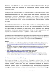 Ausbildung, keine Aufsicht und keine konsequente Rechenschaftspflicht besitzen. Es gibt glaubwürdige Berichte, dass Angehörige der Sicherheitskräfte zahlreiche Übergriffe begehen (USDOS 12.4.2022). Die Regierung der Nationalen Einheit und nichtstaatliche Akteure halten sich weitgehend an das Waffenstillstandsabkommen von 2020, obwohl beide Seiten weiterhin Unterstützung von ausländischen Streitkräften, ausländischen Kämpfern und Söldnern erhalten. Informelle nichtstaatliche bewaffnete Gruppen füllen Sicherheitslücken im ganzen Land. ISIS-Libyen versucht, eine begrenzte Präsenz in der südwestlichen Wüste aufrechtzuerhalten (USDOS 12.4.2022). Das Waffenstillstandsabkommen vom Oktober 2020 zwischen der ehemaligen Regierung der Nationalen Eintracht und Haftars LAAF sah den Abzug aller ausländischen Kämpfer aus dem Land vor. Nach Angaben der UN-Mission in Libyen hielten sich im September 2021 Tausende ausländischer Kämpfer aus Syrien, Russland, dem Tschad und dem Sudan, darunter auch Mitglieder privater Militärfirmen, in Libyen auf (HRW 13.1.2022; vgl. AI 29.3.2022). Die staatlichen Sicherheitsorgane können grundsätzlich keinen ausreichenden Schutz garantieren. Bewaffnete Gruppen mit zum Teil unklarer Zugehörigkeit treten häufig als Vertreter der öffentlichen Ordnung auf, sind jedoch nicht ausgebildet und wenig berechenbar (AA 30.5.2022). Quellen: -AA - Auswärtiges Amt der Bundesrepublik [Deutschland] (30.5.2022): Libyen: Reisewarnung, https://www.auswaertiges-amt.de/de/ReiseUndSicherheit/libyensicherheit/219624, Zugriff 31.5.2022 -AI - Amnesty International (29.3.2022): Amnesty International Report 2021/22; The State of the World's Human Rights; Libya 2021, https://www.ecoi.net/de/dokument/2070278.html, Zugriff 16.5.2022 -HRW - Human Rights Watch (13.1.2022): World Report 2022 - Libya, https://www.ecoi.net/de/dokument/2066557.html, Zugriff 16.5.2022 -USDOS - U.S. Department of State [USA] (12.4.2022): 2021 Country Reports on Human Rights Practices: Libya, https://www.ecoi.net/de/dokument/2071167.html, Zugriff 16.5.2022 7. Folter und unmenschliche Behandlung Die Verfassungserklärung und nach-revolutionäre Gesetzgebung verbietet Folter. Folter und andere Misshandlungen sind in Gefängnissen, Haftanstalten und inoffiziellen Haftanstalten jedoch verbreitet (USDOS 12.4.2022) bzw. wird diese systematisch angewendet (AI 29.3.2022). Bewaffnete Gruppen, Milizen und Sicherheitskräfte führen außergerichtliche Hinrichtungen, erzwungenes Verschwindenlassen und Folter sowie sexuelle Gewalt und willkürliche Verhaftungen .BFA Bundesamt für Fremdenwesen und Asyl Seite 12 von 24