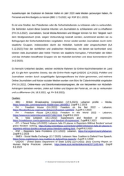 Auswirkungen der Explosion im Beiruter Hafen im Jahr 2020 viele Medien gezwungen haben, ihr Personal und ihre Budgets zu kürzen (BBC 17.5.2022; vgl. RSF 23.1.2023). Es ist eine Straftat, den Präsidenten oder die Sicherheitsdienste zu kritisieren oder zu verleumden. Die Behörden nutzen diese Gesetze mitunter, um Journalisten zu schikanieren und zu inhaftieren (FH 24.2.2022). Journalisten, Social Media-Aktivisten und Blogger können für ihre Tätigkeit nach dem Strafgesetzbuch (insb. wegen Verleumdung) bestraft werden; zunehmend werden sie zu Befragungen der Sicherheitsbehörden vorgeladen. Immer wieder werden Journalisten durch nicht- staatliche Gruppen, insbesondere durch die Hizbollah, bedroht oder eingeschüchtert (AA 5.12.2022).Trotz der rechtlichen und praktischen Hindernisse, mit denen sie konfrontiert sind, können viele Journalisten über heikle Themen wie staatliche Korruption, Fehlverhalten der Eliten und das Verhalten bewaffneter Gruppen wie der Hizbollah berichten und diese kommentieren (FH 24.2.2022). Es herrscht Unklarheit darüber, welcher rechtliche Rahmen für Online-Nachrichtenseiten im Land gilt. Es gibt kein spezielles Gesetz, das die Online-Rede regelt (USDOS 12.4.2022). Politiker und Journalisten werden durch ausgeklügelte Spionagesoftware ins Visier genommen, und mehrere Online-Journalisten und Nutzer sozialer Medien wurden vom Büro für Cyberkriminalität vorgeladen (FH 3.6.2022). Online-Hass- und Desinformationskampagnen, die von Netzwerken von Hizbollah- Anhängern betrieben werden, zielen auf Kritiker und Gegner der Partei ab, um sie zu verleumden und zu diffamieren (NL 16.3.2022; vgl. FH 3.6.2022). Quellen: -BBC - British Broadcasting Corporation (17.5.2022): Lebanon profile – Media, https://www.bbc.com/news/world-middle-east-14648683, Zugriff 8.2.2023 -FH - Freedom House (3.6.2022): Freedom on the Net 2022 – Lebanon, https://freedomhouse.org/country/lebanon/freedom-net/2022, Zugriff 8.2.2023 -FH - Freedom House (24.2.2022): Freedom in the World 2022 – Lebanon, https://www.ecoi.net/en/document/2071882.html, Zugriff 8.2.2023 -NL - Now Lebanon (16.3.2022): Suppressors and freedom of expression, https://nowlebanon.com/suppressors-and-freedom-of-expression/, Zugriff 8.2.2023 -OT - L’Orient Today (4.5.2022): Lebanon falls 23 places in Reporters Without Borders' annual press freedom ranking, https://today.lorientlejour.com/article/1298372/lebanon-falls-23-places-in- reporters-without-borders-annual-press-freedom-ranking.html, Zugriff 8.2.2023 -RSF - Reporters Sans Frontières (23.1.2023): Lebanon, https://rsf.org/en/country/lebanon, Zugriff 8.2.2023 -SMEX - Social Media Exchange (13.7.2020): Lebanon: New Coalition to Defend Free Speech, https://smex.org/lebanon-new-coalition-to-defend-free-speech/, Zugriff 8.2.2022 -USDOS - United States Department of State [USA] (12.4.2022): 2021 Country Report on Human Rights Practices: Lebanon, https://www.ecoi.net/de/dokument/2071165.html, Zugriff 8.2.2023 .BFA Bundesamt für Fremdenwesen und Asyl Seite 27 von 68