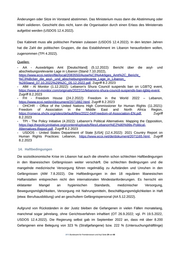 Änderungen oder Sitze im Vorstand abstimmen. Das Ministerium muss dann die Abstimmung oder Wahl validieren. Geschieht dies nicht, kann die Organisation durch einen Erlass des Ministerrats aufgelöst werden (USDOS 12.4.2022). Das Kabinett muss alle politischen Parteien zulassen (USDOS 12.4.2022). In den letzten Jahren hat die Zahl der politischen Gruppen, die das Establishment im Libanon herausfordern wollen, zugenommen (TPI 4.2022). Quellen: -AA - Auswärtiges Amt [Deutschland] (5.12.2022): Bericht über die asyl- und abschiebungsrelevante Lage in Libanon (Stand 7.10.2022), https://www.ecoi.net/en/file/local/2083550/Ausw%C3%A4rtiges_Amt%2C_Bericht_ %C3%Bcber_die_asyl-_und_abschiebungsrelevante_Lage_in_Libanon_ %28Stand_07.10.2022%29%2C_05.12.2022.pdf, Zugriff 8.2.2023 -AlM - Al Monitor (1.12.2022): Lebanon's Shura Council suspends ban on LGBTQ event, https://www.al-monitor.com/originals/2022/11/lebanons-shura-council-suspends-ban-lgbtq-event, Zugriff 8.2.2023 -FH - Freedom House (24.2.2022): Freedom in the World 2022 – Lebanon, https://www.ecoi.net/en/document/2071882.html, Zugriff 8.2.2023 -OHCHR - Office of the United Nations High Commissioner for Human Rights (11.2021): Freedom of Association in the Middle East and North Africa Region, https://romena.ohchr.org/sites/default/files/2022-04/Freedom-of-Association-EN.pdf, Zugriff 8.2.2023 -TPI - The Policy Initiative (4.2022): Lebanon’s Political Alternatives: Mapping the Opposition, https://api.thepolicyinitiative.org/content/uploads/files/Lebanon%E2%80%99s-Political- Alternatives-Report.pdf, Zugriff 8.2.2023 -USDOS - United States Department of State [USA] (12.4.2022): 2021 Country Report on Human Rights Practices: Lebanon, https://www.ecoi.net/de/dokument/2071165.html, Zugriff 8.2.2023 14. Haftbedingungen Die sozioökonomische Krise im Libanon hat auch die ohnehin schon schlechten Haftbedingungen in den libanesischen Gefängnissen weiter verschärft. Die schlechten Bedingungen und die mangelnde medizinische Versorgung führen regelmäßig zu Aufständen und Unruhen in den Gefängnissen (AlM 7.8.2022). Die Haftbedingungen in den 18 regulären libanesischen Haftanstalten entsprechen nicht den internationalen Mindestanforderungen. Es herrscht ein eklatanter Mangel an hygienischen Standards, medizinischer Versorgung, Bewegungsmöglichkeiten, Versorgung mit Nahrungsmitteln, Beschäftigungsmöglichkeiten in Haft (etwa: Berufsausbildung) und an geschultem Gefängnispersonal (AA 5.12.2022). Aufgrund von Rückständen in der Justiz bleiben die Gefangenen in vielen Fällen monatelang, manchmal sogar jahrelang, ohne Gerichtsverfahren inhaftiert (OT 26.9.2022; vgl. PI 19.5.2022, USDOS 12.4.2022). Die Regierung selbst gab im September 2022 an, dass mit über 8.200 Gefangenen eine Belegung von 323 % (Strafgefangene) bzw. 222 % (Untersuchungshäftlinge) .BFA Bundesamt für Fremdenwesen und Asyl Seite 29 von 68