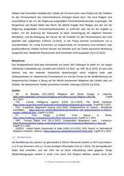 Religion des Konvertiten bestätigt wird, sodass der Konvertit seine neue Religion bei der Direktion für den Personenstand des Innenministeriums eintragen lassen kann. Die neue Religion wird anschließend in die von der Regierung ausgestellten Personenstandsurkunden eingetragen. Die Bürgerinnen und Bürger haben das Recht, die übliche Angabe ihrer Religion aus den von der Regierung ausgestellten Personenstandsurkunden zu entfernen oder die Art der Angabe zu ändern. Für die Änderung der Dokumente ist keine Genehmigung der religiösen Beamten erforderlich, und die Eintragung der Person bei der Direktion für den Personenstand wird nicht geändert oder aufgehoben (USDOS 2.6.2022). In der Praxis kommen Konversionen nur in Ausnahmefällen vor, zumal Konvertiten nur eingeschränkt mit Verständnis ihres familiären oder gesellschaftlichen Umfelds rechnen können und allenfalls auch der Gefahr physischer Bedrohung ausgesetzt sind. Staatlichen Repressionen sind Konvertiten nicht ausgesetzt (AA 5.12.2022). Blasphemie Das Strafgesetzbuch sieht eine Höchststrafe von einem Jahr Gefängnis für jeden vor, der wegen „öffentlicher Gotteslästerung“ verurteilt wird (USDOS 2.6.2022; vgl. HRF 26.11.2022). Es wird nicht definiert, was dies bedeutet. Gesetzliche Bestimmungen sehen mögliche Geld- oder Gefängnisstrafen für sektiererische Provokationen vor und der Presse ist die Veröffentlichung von blasphemischen Inhalten in Bezug auf die offiziell anerkannten Religionen des Landes oder von Inhalten, die sektiererische Fehden provozieren könnten, untersagt (USDOS 2.6.2022). Quellen: -AB - Al Bawaba (25.1.2022): Religious and Ethnic Groups in Lebanon, https://www.albawaba.com/opinion/religious-and-ethnic-groups-lebanon-1463785, Zugriff 30.1.2023 -CIA - Central Intelligence Agency [USA] (11.1.2023): The World Factbook, https://www.cia.gov/the-world-factbook/countries/lebanon/#people-and-society, Zugriff 30.1.2023 -FAZ - Frankfurter Allgemeine Zeitung (18.8.2020): Religionsführer im Libanon : Moralische Autoritäten, https://www.faz.net/aktuell/politik/ausland/welche-rolle-religionsfuehrer-im-libanon- spielen-16909146.html, Zugriff 6.3.2023 -FT - First Things (1.2023): From Mecca to Rome, https://www.firstthings.com/article/2023/01/from-mecca-to-rome, Zugriff 31.1.2023 -HRF - Human Rights First (26.11.2022): Compendium Blasphemy Laws – Lenbanon, https://humanrightsfirst.org/wp-content/uploads/2022/11/Compendium-Blasphemy-Laws.pdf, Zugriff 31.1.2023 -USDOS - United States Department of State [USA] (2.6.2022): 2021 Report on International Religious Freedom: Lebanon, https://www.ecoi.net/de/dokument/2074032.html, Zugriff 30.1.2023 17. Minderheiten Die Bevölkerung des Libanon von geschätzten 5.296.814 Menschen besteht zu 95 % aus Arabern, zu 4 % aus Armeniern und zu 1 % aus sonstigen Ethnizitäten (CIA 11.1.2023). Die demografischen Daten sind umstritten, und seit 1932 hat es keine Volkszählung mehr gegeben. Einige Minderheitengruppen werden in erster Linie durch ihre Religion definiert, andere durch ihre .BFA Bundesamt für Fremdenwesen und Asyl Seite 34 von 68