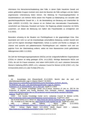 informieren ihre Menschenrechtsabteilung über Fälle, in denen Opfer häuslicher Gewalt und andere gefährdete Gruppen involviert sind, damit die Beamten die Fälle verfolgen und den Opfern angemessene Unterstützung bieten können. Die Abteilung für Frauenangelegenheiten im Sozialministerium und mehrere NGOs setzen ihre Projekte zur Bekämpfung von sexueller oder geschlechtsspezifischer Gewalt fort, z. B. die Bereitstellung von Beratung und Unterkünften für Opfer (USDOS 12.4.2022). Der Libanon ist ein Zielland des internationalen Frauenhandels, vornehmlich aus Osteuropa, Russland und Syrien. Die Regierung arbeitet inzwischen mit NGOs zusammen, um diesen die Betreuung von Opfern des Frauenhandels zu ermöglichen (AA 5.12.2022). Besonders schwierig ist die Situation von Flüchtlingsfrauen in der gegenwärtigen Krise. Dies beschränkt sich nicht nur auf die krisenbedingte wirtschaftliche Belastung, sondern bezieht sich auch auf ihre eigenen derzeitigen Möglichkeiten, Schutz zu suchen und Rechte zu erlangen. Im Libanon sind syrische und palästinensische Flüchtlingsfrauen und -mädchen noch weit von jeglicher Form der Gleichstellung entfernt, selbst mit ihren libanesischen (nicht geflüchteten) Mitbürgerinnen (HBS 2.12.2022). Die Zahl der Nichtregierungsorganisationen (NGOs) und der zivilgesellschaftlichen Organisationen (CSOs) im Libanon ist stetig gestiegen (ICNL 14.11.2022). Wichtige libanesische NGOs und CSOs, die sich für Frauen einsetzen, sind neben KAFA (KAFA o.D.) auch Lebanese Democratic Women’s Gathering (RDFL) (RDFL o.D.), Lebanese Council for Women (LCW) (CSKC o.D.), Dar Al Amal (DAA) (DAA o.D.) oder Fe-Male (FM o.D.). Quellen: -AA - Auswärtiges Amt [Deutschland] (5.12.2022): Bericht über die asyl- und abschiebungsrelevante Lage in Libanon (Stand 7.10.2022), https://www.ecoi.net/en/file/local/2083550/Ausw%C3%A4rtiges_Amt%2C_Bericht_ %C3%Bcber_die_asyl-_und_abschiebungsrelevante_Lage_in_Libanon_ %28Stand_07.10.2022%29%2C_05.12.2022.pdf, Zugriff 27.1.2023 -CSKC - Civil Society Knowledge Center (31.12.2014): Issuance of Law no. 293 for the Protection of Women and Family Members from Domestic Violence, https://civilsociety- centre.org/content/issuance-law-no-293-protection-women-and-family-members-domestic- violence, Zugriff 30.1.2023 -CSKC - Civil Society Knowledge Center (o.D.): Lebanese Council for Women (LCW), https://civilsociety-centre.org/content/lebanese-council-women-lcw, Zugriff 30.1.2023 -Dar Al Amal (DAA) (o.D.): About Us, https://www.dar-alamal.org/aboutus.php, Zugriff 30.1.2023 -FM - Fe-Male (o.D.) Who We Are, https://www.fe-male.org/who-we-are, Zugriff 30.1.2023 -HBS - Heinrich Böll Stiftung – Beirut Office (2.12.2022): https://lb.boell.org/sites/default/files/2022-12/fqml-en-e.pdf, Zugriff 30.1.2023 -HRW - Human Rights Watch (12.1.2023): World Report 2023 – Lebanon, https://www.ecoi.net/de/dokument/2085471.html, Zugriff 30.1.2023 .BFA Bundesamt für Fremdenwesen und Asyl Seite 40 von 68