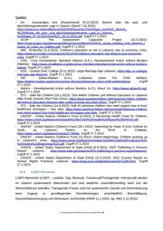 Quellen: -AA - Auswärtiges Amt [Deutschland] (5.12.2022): Bericht über die asyl- und abschiebungsrelevante Lage in Libanon (Stand 7.10.2022), https://www.ecoi.net/en/file/local/2083550/Ausw%C3%A4rtiges_Amt%2C_Bericht_ %C3%Bcber_die_asyl-_und_abschiebungsrelevante_Lage_in_Libanon_ %28Stand_07.10.2022%29%2C_05.12.2022.pdf, Zugriff 27.1.2023 -ACAP - The Assessment Capacities Project (31.5.2022): https://www.acaps.org/sites/acaps/files/products/files/20220531_acaps_briefing_note_lebanon_i mpact_of_crisis_on_children.pdf, Zugriff 27.1.2023 -AlM - Al-Monitor (4.3.2022): Children's education at risk in Lebanon due to economic crisis, https://www.al-monitor.com/originals/2022/03/childrens-education-risk-lebanon-due-economic- crisis, Zugriff 27.1.2023 -CHS - Core Humanitarian Standard Alliance (o.D.): Developmental Action without Borders (Naba'a), https://www.chsalliance.org/about/our-members/developmental-action-without-borders- nabaa/, Zugriff 27.1.2023 -DGC - Durban Girls’ College (9.11.2022): Legal Marriage Age Lebanon, https://dgc.co.za/legal- marriage-age-lebanon/, Zugriff 27.1.2023 -DM - Daleel-Madani (o.D.): Lebanese Union For Child Welfare, https://daleel-madani.org/ar/civil-society-directory/lebanese-union-child-welfare/about, Zugriff 27.1.2023 -Naba’a - Developmental Action without Borders (o.D.): About Us, https://www.nabaa-lb.org/, Zugriff 27.1.2023 -STC - Safe the Children (19.1.2023): One Million Children Left Without Education In Lebanon After Public Schools Shut Their Doors, https://www.savethechildren.net/news/one-million-children- left-without-education-lebanon-after-public-schools-shut-their-doors, Zugriff 27.1.2023 -STC - Safe the Children (14.4.2022): Half of Lebanese children now need support due to food, healthcare shortages – new data, https://www.savethechildren.net/news/half-lebanese-children- now-need-support-due-food-healthcare-shortages-new-data, Zugriff 27.1.2023 -UNICEF - United Nations Children’s Fund (4.2022): A Worsening Health Crisis for Children, https://www.unicef.org/lebanon/media/8491/file/Child%20Health%20Report%20EN%20.pdf, Zugriff 27.1.2023 -UNICEF - United Nations Children’s Fund (28.1.2022): Searching for Hope: A Grim Outlook for Youth as Lebanon Teeters on the Brink of Collapse, https://www.unicef.org/lebanon/media/7746/file, Zugriff 27.1.2023 -UNICEF - United Nations Children’s Fund (12.2021): Violent Beginnings: Children growing up in Lebanon’s crisis, https://www.unicef.org/lebanon/media/7626/file/Child%20Protection%20- %20Violent%20Beginnings%20.pdf, Zugriff 27.1.2023 -USDOS - United States Department of State [USA] (6.9.2022): 2022 Trafficking in Persons Report: Lebanon, https://www.state.gov/reports/2022-trafficking-in-persons-report/lebanon/, Zugriff 27.1.2023 -USDOS - United States Department of State [USA] (12.4.2022): 2021 Country Report on Human Rights Practices: Lebanon, https://www.ecoi.net/de/dokument/2071165.html, Zugriff 27.1.2023 18.3. LGBTI-Personen LGBTI-Menschen [LGBTI - Lesbian, Gay, Bisexual, Transexuall/Transgender, Intersexual] werden im Libanon systematisch diskriminiert und sind weiterhin unverhältnismäßig stark von der Wirtschaftskrise betroffen. Transgender-Frauen sind mit systemischer Gewalt und Diskriminierung beim Zugang zu grundlegenden Dienstleistungen, einschließlich Beschäftigung, Gesundheitsversorgung und Wohnraum, konfrontiert (HRW 12.1.2023; vgl. HBS 2.12.2022). .BFA Bundesamt für Fremdenwesen und Asyl Seite 44 von 68