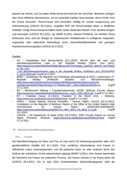 besucht die Schule, und nur jedes fünfte Roma-Kind besucht die Vorschule. Behörden verfügen über keine effektiven Mechanismen, um an vulnerable Familien heranzutreten, deren Kinder nicht die Schule besuchen. Roma-Frauen sind besonders anfällig für soziale Ausgrenzung und Diskriminierung (USDOS 30.3.2021). Ungefähr 60% der Roma-Familien leben in ländlichen Gebieten. Einige Roma-Gemeinschaften haben weder fließendes Wasser, noch sanitäre Anlagen und Heizungen (USDOS 30.3.2021; vgl. BAMF 6.2021). Weitere Probleme, mit welchen Roma konfrontiert sind, sind ein Mangel an medizinischen Notfalldiensten in entlegenen Gegenden, ungerechte oder willkürliche Behandlung durch Gesundheitsdienstleister und geringere Krankenversicherungsraten (USDOS 30.3.2021). Quellen: - AA – Auswärtiges Amt [Deutschland] (31.1.2022): Bericht über die asyl- und abschiebungsrelevante Lage in der Republik Moldau (Stand: Juni 2021), https://www.ecoi.net/en/file/local/2068039/Ausw%C3%A4rtiges_Amt%2C _Bericht_%C3%Bcb er_die_asyl- _und_abschiebungsrelevante_Lage_in_der_Republik_Moldau_%28Stand_Juni_2021%29%2 C_31.01.2022.pdf, Zugriff 15.2.2022 - BAMF – Bundesamt für Migration und Flüchtlinge [Deutschland] (6.2021): Länderreport 37: Republik Moldau (Politische Situation und Menschenrechtslage), https://www.bamf.de/SharedDocs/Anlagen/DE/Behoerde/Informationszentrum/ Laenderreporte/2021/laenderreport-37-Moldau.pdf?__blob=publicationFile&v=2, Zugriff 27.12.2021 - BS – Bertelsmann Stiftung / Transformationsindex (2020): Moldova Country Report, https://www.ecoi.net/en/file/local/2029516/country_report_2020_MDA.pdf, Zugriff 27.12.2021 - FH – Freedom House (3.3.2021): Freedom in the World 2021 – Moldova, https://www.ecoi.net/de/dokument/2046529.html, Zugriff 27.12.2021 - UNGA – United Nations General Assembly / Human Rights Council (10.11.2021): Compilation on the Republic of Moldova: Report of the Office of the United Nations High Commissioner for Human Rights (A/HRC/WG.6/40/MDA/2), https://www.ecoi.net/en/file/local/2065971/A_HRC_WG.6_40_MDA_2_E.pdf, Zugriff 19.1.2022 - USDOS – US Department of State [USA] (30.3.2021): 2020 Country Report on Human Rights Practices: Moldova, https://www.ecoi.net/de/dokument/2048126.html, Zugriff 27.12.2021 16. Relevante Bevölkerungsgruppen 16.1. Frauen Die Gleichberechtigung von Mann und Frau ist zwar durch die Verfassung garantiert, aber nicht gesellschaftliche Realität (AA 31.1.2022). Trotz rechtlicher Gleichstellung sind Frauen im öffentlichen Leben unterrepräsentiert, und die politische Kultur ist unter anderem durch den Einfluss der orthodoxen Kirche patriarchalisch geprägt (BAMF 6.2021). Kein Gesetz beschränkt die Teilnahme von Frauen am politischen Prozess, und Frauen nehmen in der Praxis daran teil (USDOS 30.3.2021). Ein im April 2016 verabschiedetes Gleichstellungsgesetz sieht die .BFA Bundesamt für Fremdenwesen und Asyl Seite 29 von 42