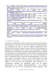 - DEU – Delegation of the European Union to the Republic of Moldova (22.11.2021): The Republic of Moldova and the EU, https://eeas.europa.eu/delegations/moldova/1538/republic- moldova-and-eu_en, Zugriff 4.1.2022 - EC – European Commission (13.10.2021): Joint Staff Working Document: Association Implementation Report on the Republic of Moldova, https://eeas.europa.eu/sites/default/files/swd_2021_295_f1_joint_staff_working_paper_en_v2 _p1_1535649.pdf, Zugriff 7.1.2022 - HF – Heritage Foundation (o.D.a): 2021 Index of Economic Freedom: Moldova, https://www.heritage.org/index/country/moldova, Zugriff 21.1.2022 - HF – Heritage Foundation (o.D.b): 2022 Index of Economic Freedom: Moldova, https://www.heritage.org/index/country/moldova, Zugriff 16.2.2022 - IOM – Internationale Organisation für Migration (o.D.): REPUBLIK MOLDAU: LÄNDERINFORMATIONSBLATT 2021, https://files.returningfromgermany.de/files/CFS_2021_Republik%20Moldau_DE.pdf, Zugriff 4.2.2022 - SSA – Social Security Administration [USA] (9.2018): Social Security Programs Throughout the World: Europe, 2018 – Moldova, https://www.ecoi.net/en/file/local/1447001/1788_1539767421_moldova.pdf, Zugriff 21.1.2022 - UNGA – United Nations General Assembly / Human Rights Council (10.11.2021): Compilation on the Republic of Moldova: Report of the Office of the United Nations High Commissioner for Human Rights (A/HRC/WG.6/40/MDA/2), https://www.ecoi.net/en/file/local/2065971/A_HRC_WG.6_40_MDA_2_E.pdf, Zugriff 19.1.2022 - USDOS – US Department of State [USA] (30.3.2021): 2020 Country Report on Human Rights Practices: Moldova, https://www.ecoi.net/de/dokument/2048126.html, Zugriff 27.12.2021 - WKO – Wirtschaftskammer Österreich [Österreich] (10.2021): Wirtschaftsbericht Republik Moldau, https://www.wko.at/service/aussenwirtschaft/moldau-wirtschaftsbericht.pdf, Zugriff 21.1.2022 19. Medizinische Versorgung Die Verfassung von 1994 garantiert in Artikel 36 das Recht auf Gesundheit und eine kostenlose Basisbehandlung durch den Staat (VFGH 29.7.1994). Die öffentliche Gesundheitsversorgung ist stark unterfinanziert (BS 2020). Es gibt eine staatliche beitragsfinanzierte Pflicht- Krankenversicherung, welche auch (gegen Zahlung einer jährlichen Versicherungsgebühr) die Behandlung nicht erwerbstätiger Personen übernimmt. Die Dienstleistungen im staatlichen Gesundheitswesen sind grundsätzlich für moldauische Staatsangehörige kostenfrei, und jegliche Form der Bestechung ist unter Strafe gestellt (AA 31.1.2022). Im Bereich Gesundheitsversorgung sind Bestechungen weitverbreitet (UNGA 10.11.2021). In der Praxis sind Extrazahlungen die Regel, um beispielsweise Zugang zu bestimmten Untersuchungen/Eingriffen zu erhalten oder diesen Zugang zu beschleunigen. Ebenso ist die freie Arztwahl tatsächlich nur gegen entsprechende Zahlung möglich. Für derartige Zahlungen sind Quittungen natürlich nicht erhältlich. Sie sind somit auch nicht erstattungsfähig. Andere Leistungen wie z.B. zahnmedizinische Prophylaxen bzw. Behandlungen werden durch die staatliche Pflichtversicherung nicht abgedeckt. Behandlungsmöglichkeiten in den staatlichen Krankenhäusern sind nicht mit dem westeuropäischen Standard vergleichbar. Private .BFA Bundesamt für Fremdenwesen und Asyl Seite 39 von 42