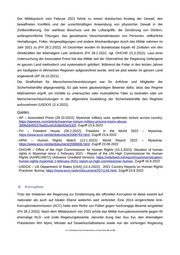 Der Militärputsch vom Februar 2021 führte zu einem drastischen Anstieg der Gewalt, des bewaffneten Konflikts und der unrechtmäßigen Anwendung von physischer Gewalt in der Zivilbevölkerung. Der wahllose Beschuss und die Luftangriffe, die Zerstörung von Dörfern, außergerichtliche Tötungen, das gewaltsame Verschwindenlassen von Personen, willkürliche Verhaftungen, Folter, Vergewaltigungen und andere Misshandlungen durch das Militär nahmen im Jahr 2021 zu (FH 28.2.2022). Im Dezember wurden im Bundesstaat Kayah 40 Zivilisten von den Streitkräften bei lebendigem Leib verbrannt (FH 28.2.2022; vgl. OHCHR 15.3.2022). Laut einer Untersuchung der Associated Press hat das Militär seit der Übernahme der Regierung Gefangene im ganzen Land methodisch und systematisch gefoltert. Während die Folter in den letzten Jahren am häufigsten in ethnischen Regionen aufgezeichnet wurde, wird sie jetzt wieder im ganzen Land angewandt (AP 28.10.2021). Die Straffreiheit für Menschenrechtsverletzungen war für Anführer und Mitglieder der Sicherheitskräfte allgegenwärtig. Es gab keine glaubwürdigen Beweise dafür, dass das Regime Maßnahmen ergriff, um Vorfälle zu untersuchen oder mutmaßliche Täter zu bestrafen oder um Menschenrechtsschulungen in die allgemeine Ausbildung der Sicherheitskräfte des Regimes aufzunehmen (USDOS 12.4.2022). Quellen: -AP – Associated Press (28.10.2022): Myanmar military uses systemaitc torture across country, https://apnews.com/article/myanmar-torture-military-prisons-insein-abuse- 390fe5b49337be82ce91639e93e0192f, Zugriff 23.8.2022 -FH – Freedom House (28.2.2022): Freedom in the World 2022 – Myanmar, https://www.ecoi.net/de/dokument/2068763.html, Zugriff 23.8.2022 -HRW – Human Rights Watch (13.1.2022): World Report 2022 – Myanmar, https://www.ecoi.net/de/dokument/2068606.html, Zugriff 23.08.2022 -OHCHR – Office of the High Commissioner for Human Rights (15.3.2022): Situation of human rights in Myanmar since 1 February 2021 - Report of the UN High Commissioner for Human Rights (A/HRC/49/72) (Advance Unedited Version), https://reliefweb.int/report/myanmar/situation- human-rights-myanmar-1-february-2021-report-un-high-commissioner-human, Zugriff 16.8.2022 -USDOS – US Department of States [USA] (12.4.2022): 2021 Country Reports on Human Rights Practices: Burma, https://www.ecoi.net/en/document/2071145.html, Zugriff 23.8.2022 8. Korruption Trotz der Initiativen der Regierung zur Eindämmung der offiziellen Korruption ist diese sowohl auf nationaler als auch auf lokaler Ebene weiterhin weit verbreitet. Eine 2014 eingerichtete Anti- Korruptionskommission (ACC) hatte eine Reihe von Fällen gegen hochrangige Beamte eingeleitet (FH 28.2.2022). Nach dem Militärputsch von 2021 erhob das Militär Korruptionsvorwürfe gegen 45 ehemalige NLD- und zivile Regierungsbeamte, darunter Aung San Suu Kyi, den ehemaligen Präsidenten Win Myint, Minister auf Gewerkschaftsebene sowie von der vorherigen Regierung .BFA Bundesamt für Fremdenwesen und Asyl Seite 22 von 55