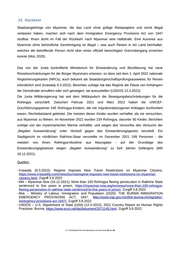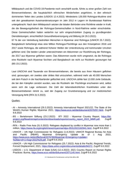 Militärputsch und die COVID-19-Pandemie noch verschärft wurde, führte zu einer großen Zahl von Binnenvertriebenen, die hauptsächlich ethnischen Minderheiten angehören, in den ethnisch dominierten Teilen des Landes (USDOS 12.4.2022). Mindestens 126.000 Rohingya-Muslime sind seit den gewaltsamen Auseinandersetzungen im Jahr 2012 in Lagern im Bundesstaat Rakhine untergebracht. Nach dem Militärputsch setzten die lokalen Behörden eine Richtlinie wieder in Kraft, die die Bewegungsfreiheit der Rohingya-Gemeinschaften in Nord-Rakhine weiter einschränkte. Diese Gemeinschaften hatten weiterhin nur sehr eingeschränkten Zugang zu grundlegenden Dienstleistungen, einschließlich Gesundheitsversorgung und Bildung (AI 29.3.2022). 67 % der von Vertreibung bedrohten Menschen in Myanmar sind Rohingya (UNHCR 25.7.2022). Bangladesch beherbergt etwa eine Million Rohingya-Flüchtlinge aus den Krisenjahren 2016 und 2017 sowie Rohingya, die während früherer Wellen der Unterdrückung und kommunaler Unruhen geflohen sind. Die beiden Länder unterzeichneten ein Abkommen zur Rückführung der Rohingya, die 2017 aus Myanmar geflohen waren. Das Abkommen wurde nicht umgesetzt, da die Rohingya eine Rückkehr nach Myanmar fürchten und Bangladesch sie nicht zur Rückkehr gezwungen hat (BS 23.2.2022). Laut UNOCHA sind Tausende von Binnenvertriebenen, die bereits aus ihren Häusern geflohen sind, gezwungen, ein zweites oder drittes Mal umzuziehen, während mehr als 40.000 Menschen seit dem Putsch in die Nachbarländer geflüchtet sind. UNOCHA zählte fast 13.000 zivile Gebäude, die bei den Kämpfen zerstört wurden, was die Rückkehr der Flüchtlinge erschweren wird, selbst wenn sich die Lage verbessert. Die Zahl der lebensbedrohlichen Krankheiten unter den Binnenvertriebenen nimmt zu, weil der Zugang zur Grundversorgung und zur medizinischen Versorgung fehlt (RFA 31.5.2022). Quellen: -AI – Amnesty International (29.3.2022): Amnesty International Report 2021/22; The State of the World's Human Rights; Myanmar 2021, https://www.ecoi.net/de/dokument/2070257.html, Zugriff 9.8.2022 -BS – Bertelsmann Stiftung (23.2.2022): BTI 2022 - Myanmar Country Report, https://bti- project.org/fileadmin/api/content/en/downloads/reports/country_report_2022_MMR.pdf, Zugriff 9.8.2022 -RFA – Radio Free Asia (31.5.2022): Refugees displaced by conflict in Myanmar now more than 1 million, https://www.rfa.org/english/news/myanmar/idps-05312022182941.html, Zugriff 9.8.2022 -UNHCR – UN High Commissioner for Refugees (1.8.2022): UNHCR Regional Bureau for Asia and Pacific (RBAP); Myanmar Emergency Update as of 1 Aug 2022, https://www.ecoi.net/en/file/local/2076780/Myanmar+Emergency+Update+ %28as+of+1+Aug+2022%29.pdf, Zugriff 9.8.2022 -UNHCR – UN High Commissioner for Refugees (25.7.2022): Asia & the Pacific; Regional Trends; Forced Displacement; 2021, https://data.unhcr.org/en/documents/details/94372, Zugriff 9.8.2022 -USDOS – U.S. Department of State [USA] (12.4.2022): 2021 Country Report on Human Rights Practices: Burma, https://www.ecoi.net/de/dokument/2071145.html, Zugriff 9.8.2022 .BFA Bundesamt für Fremdenwesen und Asyl Seite 49 von 55