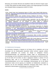 Behauptung, die humanitäre Hilfe käme den bewaffneten Kräften der ethnischen Gruppen zugute. In einigen Fällen gewährte das Militär allmählich Zugang, als die Regierungstruppen die Kontrolle über umkämpfte Gebiete zurückgewannen (USDOS 12.4.2022). Quellen: -DTDA - Danish Trade Union Development Agency (11.2021): Labour Market Profile Myanmar – 2021/2022, https://www.ulandssekretariatet.dk/wp-content/uploads/2021/12/LMP-Myanmar-2021- Final1.pdf, Zugriff 9.8.2022 -Febis (14.02.2022): Country report. Worldbox Business Intelligence Risk Rating – Myanmar, https://www.febis.org/2022-02-14-worldbox-business-intelligence-risk-rating-myanmar/, Zugriff 4.8.2022 -HRC – Human Rights Council (14.6.2022): Losing a generation: how the military junta is devastating Myanmar’s children and undermining Myanmar’s future. Conference room paper of the Special Rapporteur on the situation of human rights in Myanmar, https://reliefweb.int/report/myanmar/losing-generation-how-military-junta-devastating-myanmars- children-and-undermining-myanmars-future-conference-room-paper-special-rapporteur-situation- human-rights-myanmar-ahrc50crp1, Zugriff 5.8.2022 -UN – United Nations Myanmar (01.10.2021): The International Organization for Migration continues to provide essential humanitarian and livelihoods assistance to migrants and migrant communities in need, https://myanmar.un.org/en/149464-international-organization-migration- continues-provide-essential-humanitarian-and, Zugriff 31.08.2022 -UNDP – UN Nations Development Programme (01.12.2021): Myanmar urban poverty rates set to triple, new United Nations survey finds, https://www.undp.org/asia-pacific/press-releases/myanmar-urban-poverty-rates-set-triple-new- united-nations-survey-finds, Zugriff 5.8.2022 -UNOCHA – UN Office for the Coordination of Humanitarian Affairs (12.2021): Humanitarian Needs Overview. Myanmar, https://reliefweb.int/report/myanmar/myanmar-humanitarian-needs- overview-2022-december-2021, Zugriff 5.8.2022 -USDOS – U.S. Department of State [USA] (12.4.2022): 2021 Country Report on Human Rights Practices: Burma, https://www.ecoi.net/de/dokument/2071145.html, Zugriff 9.8.2022 -WKO – Wirtschaftskammer Österreich [Österreich] (5.2021): Aussenwirtschaft. Wirtschaftsbericht Myanmar, https://www.wko.at/service/aussenwirtschaft/myanmar-wirtschaftsbericht.pdf, Zugriff 5.8.2022 22. Medizinische Versorgung Die medizinische Versorgung in Myanmar ist mit Europa nicht zu vergleichen und ist laut Auswärtigem Amt der Bundesrepublik Deutschland vielfach technisch, apparativ und/oder hygienisch problematisch (AA 3.8.2022). Der Mangel an verfügbarem Personal, Gesundheitseinrichtungen und medizinischen Vorräten tragen zur Verschlechterung der Gesundheitslage und einer schlechteren medizinischen Notversorgung bei (UNOCHA 28.6.2022; vgl. ITA 28.7.2022, NYT 22.4.2022). Vor allem in abgelegenen Gebieten, in welchen 70 % der Bevölkerung leben, fehlt es an ausreichendem Gesundheitswissen, an Zugang zu Gesundheitsdienstleistern und an einer zuverlässigen Stromversorgung, die für den Betrieb medizinischer Geräte und die Lagerung von Impfstoffen und Medikamenten unerlässlich ist. Menschen, die sich eine hochwertige medizinische Versorgung leisten können, reisen für medizinische Untersuchungen und Behandlungen ins Ausland (ITA 28.7.2022). .BFA Bundesamt für Fremdenwesen und Asyl Seite 52 von 55