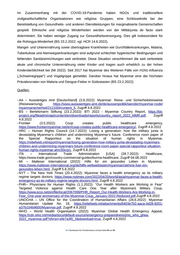 Im Zusammenhang mit der COVID-19-Pandemie haben NGOs und traditionellere zivilgesellschaftliche Organisationen wie religiöse Gruppen, eine Schlüsselrolle bei der Bereitstellung von Gesundheits- und anderen Dienstleistungen für marginalisierte Gemeinschaften gespielt. Ethnische und religiöse Minderheiten werden von der Militärjunta de facto stark diskriminiert. Sie haben weniger Zugang zur Gesundheitsversorgung. Dies gilt insbesondere für die Rohingya-Minderheit (BS 23.2.2022; vgl. HCR 14.6.2022). Mangel- und Unterernährung sowie übertragbare Krankheiten wie Durchfallerkrankungen, Malaria, Tuberkulose und Atemwegserkrankungen sind aufgrund schlechter hygienischer Bedingungen und fehlenden Sanitäreinrichtungen weit verbreitet. Diese Situation verschlimmert die weit verbreitete akute und chronische Unterernährung vieler Kinder und tragen auch erheblich zu der hohen Kindersterblichkeit bei (MI 2022). Seit 2017 hat Myanmar des Weiteren Fälle von H1N1-Influenza („Schweinegrippe“) und Vogelgrippe gemeldet. Darüber hinaus hat Myanmar eine der höchsten Prävalenzraten von Malaria und Dengue-Fieber in Südostasien (BS 23.2.2022). Quellen: -AA – Auswärtiges Amt [Deutschland] (3.8.2022): Myanmar: Reise- und Sicherheitshinweise (Reisewarnung), https://www.auswaertiges-amt.de/de/aussenpolitik/laender/myanmar-node/ myanmarsicherheit/212100#content_5, Zugriff 4.8.2022 -BS – Bertelsmann Stiftung (23.2.2022): BTI 2022 - Myanmar Country Report, https://bti- project.org/fileadmin/api/content/en/downloads/reports/country_report_2022_MMR.pdf, Zugriff 4.8.2022 -Frontier (3.5.2022): Coup creates public healthcare emergency, https://www.frontiermyanmar.net/en/coup-creates-public-healthcare-emergency/, Zugriff 4.8.2022 -HRC – Human Rights Council (14.7.2022): Losing a generation: how the military junta is devastating Myanmar’s children and undermining Myanmar’s future. Conference room paper of the Special Rapporteur on the situation of human rights in Myanmar, https://reliefweb.int/report/myanmar/losing-generation-how-military-junta-devastating-myanmars- children-and-undermining-myanmars-future-conference-room-paper-special-rapporteur-situation- human-rights-myanmar-ahrc50crp1, Zugriff 5.8.2022 -ITA – International Trade Administration [USA] (28.7.2022): Healthcare, https://www.trade.gov/country-commercial-guides/burma-healthcare, Zugriff 04.08.2022 -MI – Malteser International (2022): Hilfe für ein gesundes Leben in Myanmar, https://www.malteser-international.org/de/hilfe-weltweit/asien/myanmar/rakhine-fuer-ein- gesundes-leben.html, Zugriff 5.8.2022 -NYT – The New York Times (20.4.2022): Myanmar faces a health emergency as its military regime targets doctors, https://www.nytimes.com/2022/04/20/world/asia/myanmar-faces-a-health- emergency-as-its-military-regime-targets-doctors.html, Zugriff 4.8.2022 -PHR– Physicians for Human Rights (1.1.2022): “Our Health Workers are Working in Fear” Targeted Violence against Health Care One Year after Myanmarś Military Coup, https://www.ecoi.net/en/file/local/2067099/PHR_Report_Our-Health-Workers-Are-Working-in- Fear_One-year-anniversary-of-the-Myanmar-Coup_January-2022-Reduced.pdf,Zugriff 4.8.2022 -UNOCHA – UN Office for the Coordination of Humanitarian Affairs (28.6.2022): Myanmar Humanitarian Update No. 19, https://reliefweb.int/attachments/8403e702-aaca-4d28-9201- a37b104b9600/Myanmar.pdf, Zugriff 4.8.2022 -WHO – World Health Organisation (2022): Myanmar Global Health Emergency Appeal, https://cdn.who.int/media/docs/default-source/emergency-preparedness/jmo_who_ghea- 2022_myanmar.pdf?sfvrsn=efe7a3f0_3&download=true, Zugriff 4.8.2022 .BFA Bundesamt für Fremdenwesen und Asyl Seite 54 von 55