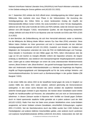 National Union/Karen National Liberation Army (KNU/KNLA) Anti-Putsch-Aktivisten unterstützt, die in ihre Gebiete entlang der Grenze geflohen sind (ACLED 23.2.2022). Am 7. September 2021 erklärte die NUG offiziell einen „Verteidigungskrieg des Volkes“ gegen die Militärjunta. Dies markierte eine neue Phase in der Volksrevolution. Die Ausrufung des Verteidigungskriegs des Volkes führte zu einem landesweiten Anstieg der Angriffe der Widerstandskräfte (Wilson Center 5.2022). Die Junta kontrolliert nur einen Teil des Staatsgebiets, während sich der Rest unter Kontrolle der EAOs und PDFs befindet, wobei die Grenzen kaum klar definiert sind (ÖB Bangkok 7.2022). Verschiedenen Quellen, die den Bürgerkrieg beobachten zufolge, befinden sich etwa 40-50 % von Myanmar unter der Kontrolle von EAOs oder PDFs (CSIS 21.6.2022). In dem Bemühen, die Zivilbevölkerung, die sich ihrer Herrschaft widersetzt, weiter zu bedrohen, hat die Militärjunta die Bildung lokaler Milizen namens Pyu Saw Htee (PSH) unterstützt. Diese Milizen haben Zivilisten ins Visier genommen und sind in Zusammenstöße mit den örtlichen Verteidigungskräften verwickelt (ACLED 23.2.2022). Zusätzlich zum Einsatz von Soldaten und Mitgliedern der Grenzpolizei unterstützt die Junta die PSH mit Waffenlieferungen und Trainings. Diese kämpfen in Koordination mit dem Militär gegen die PDFs, liefern Informationen über die Lage vor Ort und machen es mangels offizieller Uniform der Opposition schwerer, die Gegner eindeutig zu identifizieren, was wiederum eine besorgniserregende Vergeltungsdynamik auslösen kann. Zudem gab es zuletzt Meldungen von einem die Junta unterstützenden Mörderkommando namens „Blood Drinkers“ oder „Blood Brothers“, das gezielt hochrangige Oppositionelle foltern und töten soll. Andererseits verüben Widerstandskämpfer u.a. Attentate auf Angehörige des Regimes, Angriffe auf Regierungsgebäude und Sabotageangriffe auf für die Junta wichtige Verkehrs- und Kommunikationsinfrastruktur. Es kommt auch zu Bombenanschlägen in den großen Städten (ÖB Bangkok 7.2022). In der ersten Hälfte des Jahres 2022 ist der bewaffnete Kampf gegen die Junta im Vergleich zur zweiten Hälfte des Jahres 2021 weiter eskaliert, während gleichzeitig die Demonstrationen weitergehen. In den ersten sechs Monaten des Jahres verübten die staatlichen Streitkräfte weiterhin Gewalt gegen Zivilisten in ganz Myanmar. Die meisten dieser Gewalttaten waren direkte Angriffe mit Handfeuerwaffen auf Personen, die unbewaffnet sind und nicht an Demonstrationen teilnehmen. In diesem Zeitraum wurden in Myanmar mehr Vorfälle von Gewalt gegen Zivilisten durch im Inland operierende staatliche Kräfte gemeldet als in jedem anderen Land der Welt (ACLED 8.2022). Radio Free Asia hat Daten eines privaten Mobiltelefons eines Junta-Soldaten ausgewertet, auf denen Soldaten schwere Gewalttaten, einschließlich Enthauptungen, zugeben (RFA 17.6.2022). Seit der Machtübernahme durch das Militär wurden fast 2.000 Zivilisten bei Feindseligkeiten und anderen tödlichen Zwischenfällen getötet, unter anderem durch Landminen und explosive Kampfmittelrückstände (ERWs) (UNOCHA 28.6.2022). Insbesondere die Zahl der .BFA Bundesamt für Fremdenwesen und Asyl Seite 10 von 55