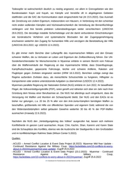 Todesopfer ist wahrscheinlich deutlich zu niedrig angesetzt, vor allem in Grenzgebieten wie den Bundesstaaten Kayin und Kayah, wo Kämpfe und Verstöße oft in abgelegenen Gebieten stattfinden und die SAC die Kommunikation stark eingeschränkt hat (AI 23.5.2022). Das Ausmaß der Zerstörung von zivilem Eigentum, insbesondere von Häusern, in Verbindung mit den scheinbar nicht enden wollenden Kämpfen wird höchstwahrscheinlich die Vertreibung der Binnenflüchtlinge verlängern und ihre bereits prekären Lebensbedingungen weiter verschlechtern (UNOCHA 28.6.2022). Die derzeitige instabile Sicherheitslage und die damit verbundenen Einschränkungen wie bürokratische Verfahren und systematische Blockaden bei der Zugangsgenehmigung erschweren weiterhin den Zugang für humanitäre Hilfe und verzögern die Bereitstellung der Hilfe (UNOCHA 28.6.2022; vgl. USDOS 12.4.2022). Es gibt immer mehr Berichte über Luftangriffe des myanmarischen Militärs und den Einsatz schwerer Waffen, die zu Verlusten an Leben und Eigentum der Zivilbevölkerung führen. Der UN- Sonderberichterstatter für Menschenrechte in Myanmar erklärte in seinem Bericht vom Februar über die Waffenverkäufe der Regierung an das myanmarische Militär, dass Düsenflugzeuge, Kampfhubschrauber, gepanzerte Fahrzeuge, leichte und schwere Artillerie, Raketen und Flugkörper gegen Zivilisten eingesetzt werden (HRW 18.3.2022). Berichten zufolge zwingt das Regime außerdem Zivilisten dazu, als menschliche Schutzschilde zu fungieren, Hilfsgüter zu transportieren oder andere unterstützende Aufgaben zu übernehmen (USDOS 12.4.2022). Myanmars parallele Regierung der Nationalen Einheit (NUG) erklärte im Juni 2022, ihr bewaffneter Flügel, die Volksverteidigungskräfte (PDF), seien gereift und näherten sich über ein Jahr nach ihrer Gründung dem Niveau einer Berufsarmee an. Die NUG hat allerdings auch eingeräumt, dass die Versorgung mit Waffen und Munition ein Schwachpunkt bleibt. Der NUG und den EAOs ist es bisher nur gelungen, c.a. 20 bis 25 % aller von den Anti-Junta-Kämpfern benötigten Waffen zu beschaffen, größtenteils mit Hilfe von öffentlichen Spenden und eigenem Geld, während die von den Widerstandskämpfern selbst gebauten Gewehre weiterhin 30 bis 40 % der PDF-Waffen ausmachen (Irrawady 22.6.2022). Nachdem die NUG den „Verteidigungskrieg des Volkes“ ausgerufen hat, lassen sich mehrere Konfliktherde im ganzen Land ausmachen. Anyar, Chin, Kachin, Shan, Karenni und Karen State sind die Schauplätze des Konflikts, ebenso wie die Ausbrüche der Stadtguerilla in den Großstädten und im konfliktträchtigen Rakhine State (Wilson Center 5.2022). Quellen: -ACLED – Armed Conflict Location & Event Data Project (8.2022): Myanmar Mid-Year Update - Continued Resistance Against the Military Coup, https://acleddata.com/10-conflicts-to-worry- about-in-2022/myanmar/mid-year-update/, Zugriff 25.8.2022 -ACLED – Armed Conflict Location & Event Data Project (23.2.2022): Myanmar - Continued Resistance Against the Military Coup, https://acleddata.com/10-conflicts-to-worry-about-in-2022/myanmar/, Zugriff 25.8.2022 .BFA Bundesamt für Fremdenwesen und Asyl Seite 11 von 55