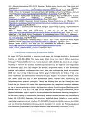 -AI – Amnesty International (23.5.2022): Myanmar: “Bullets rained from the sky”: War crimes and displacement in eastern Myanmar, https://www.ecoi.net/en/file/local/2073763/ASA1656292022ENGLISH.pdf, Zugriff 26.8.2022 -CSIS – Center for Strategie & International Studies (21.6.2022): Is Myanmar’s Military on Its Last Legs?, https://www.csis.org/analysis/myanmars-military-its-last-legs, Zugriff 25.8.2022 -HRW – Human Rights Watch (18.3.2022): Myanmar: UN Rights Body Should Advance Justice; Support Arms Embargo, Stronger Targeted Sanctions, https://www.ecoi.net/en/document/2069882.html, Zugriff 25.8.2022 -Irrawady (22.6.2022): Myanmar’s Armed Resistance Groups Ready to go on Offensive: NUG, https://www.irrawaddy.com/news/burma/myanmars-armed-resistance-groups-ready-to-go-on- offensive-nug.html, Zugriff 25.8.2022 -ÖB Bangkok – Österreichische Botschaft Bangkok [Österreich] (7.2022): Asylländerbericht Myanmar -RFA – Radio Free Asia (17.6.2022): ‚I had to cut off the head, bro‘, https://www.rfa.org/english/news/special/myanmar-soldier-atrocities/index.html, Zugriff 25.8.2022 -UNOCHA – UN Office for the Coordination of Humanitarian Affairs (28.6.2022): Myanmar – Humanitarian Update No.19, https://reliefweb.int/report/myanmar/myanmar-humanitarian-update- no-19-28-june-2022, Zugriff 25.8.2022 -USDOS – US Department of States [USA] (12.4.2022): 2021 Country Reports on Human Rights Practices: Burma, https://www.ecoi.net/en/document/2071145.html, Zugriff 25.8.2022 -Wilson Center (5.2022): One Year On: The Momentum of Myanmar’s Armed Rebellion, https://www.wilsoncenter.org/sites/default/files/media/uploads/documents/ ASIA_220519_1YearOn-BRIEF_V1r2.pdf, Zugriff 25.8.2022 4.1.Regionale Problemzone Bundesstaat Rakhin Im August 2017 ging das Militär in Myanmar brutal gegen die Rohingya-Muslime im Bundesstaat Rakhine vor (ICG 22.8.2022). Fünf Jahre später leben immer noch über 1 Million staatenlose Rohingya in Notunterkünften fern ihrer Heimat (Concern USA 4.8.2022). Bis heute ist kein einziger Flüchtling im Rahmen des formellen Rückführungsmechanismus, den Myanmar und Bangladesch im November 2017, kurz nach Beginn des Exodus, eingerichtet haben, in den Bundesstaat Rakhine zurückgekehrt. Erschwerend kam hinzu, dass das myanmarische Militär im Dezember 2018 einen neuen Krieg im Bundesstaat Rakhine gegen Aufständische der Arakan-Armee (AA), einer bewaffneten pro-rakhinesischen ethnischen Gruppe, begann. Die schweren Kämpfe, die in den Jahren 2019 und 2020 in dem Bundesstaat tobten, machten eine Rückführung aus Sicherheitsgründen praktisch unmöglich. Obwohl der Rakhine-Staat von der Gewalt nach dem Putsch, die seit Februar 2021 weite Teile Myanmars erfasst hat, weitgehend verschont geblieben ist, hat die Machtergreifung des Militärs die Aussichten auf eine Rückführung der Flüchtlinge weiter beeinträchtigt (ICG 22.8.2022). Die rund 200.000 Mitglieder der Rohingya-Gemeinschaft, die in Myanmar verbleiben, sind in Lagern für Binnenvertriebene im Bundesstaat Rakhine untergebracht, wo sie keinen Zugang zu medizinischer Versorgung, anderen sozialen Diensten und Beschäftigung haben (BS 23.2.2022). Diejenigen, die versuchen, außerhalb dieser Gebiete zu reisen, werden regelmäßig festgenommen und inhaftiert (FH 28.2.2022). Obwohl der Konflikt zwischen dem Militär und der ethnischen Rakhine-Bevölkerung derzeit deeskaliert ist, werden die Rohingya aufgrund ihrer ethnischen Zugehörigkeit und Religion weiterhin stark diskriminiert (USDOS 12.4.2022). .BFA Bundesamt für Fremdenwesen und Asyl Seite 12 von 55