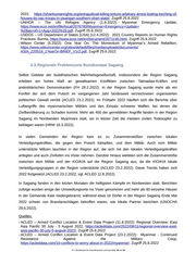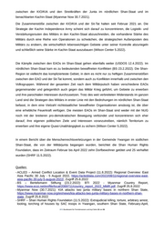 Quellen: -ACLED – Armed Conflict Location & Event Data Project (11.8.2022): Regional Overview: East Asia Pacific 30 July - 5 August 2022, https://acleddata.com/2022/08/11/regional-overview-east- asia-pacific-30-july-5-august-2022/, Zugriff 25.8.2022 -BS – Bertelsmann Stiftung (23.2.2022): BTI 2022 - Myanmar Country Report, https://www.ecoi.net/en/file/local/2069711/country_report_2022_MMR.pdf, Zugriff 25.8.2022 -Concern USA (4.8.2022): Five Years On, Rohingya Refugees Face Dire Conditions and a Long Road Ahead, https://www.concernusa.org/story/rohingya-crisis-explained/, Zugriff 25.8.2022 -FH – Freedom House (28.2.2022): Freedom in the World 2022 – Myanmar, https://www.ecoi.net/de/dokument/2068763.html, Zugriff 25.8.2022 -ICG – International Crisis Group (22.8.2022): Five Years On, Rohingya Refugees Face Dire Conditions and a Long Road Ahead, https://www.crisisgroup.org/asia/south-east-asia/myanmar/five-years-rohingya-refugees-face-dire- conditions-and-long-road-ahead, Zugriff 25.8.2022 -UNHCR – The UN Refugee Agency (1.8.2022): Myanmar Emergency Update, https://www.ecoi.net/en/file/local/2076780/Myanmar+Emergency+Update+ %28as+of+1+Aug+2022%29.pdf, Zugriff 25.8.2022 -USDOS – US Department of States [USA] (12.4.2022): 2021 Country Reports on Human Rights Practices: Burma, https://www.ecoi.net/en/document/2071145.html, Zugriff 25.8.2022 -USIP – United States Institute of Peace (21.7.2022): In Myanmar’s Rakhine State, a Fraying Truce May Hold Key to Anti-Regime Fight, https://www.usip.org/publications/2022/07/myanmars- rakhine-state-fraying-truce-may-hold-key-anti-regime-fight, Zugriff 25.8.2022 4.2.Regionale Problemzonen Bundesstaaten Shan und Kachin In den ethnischen Konfliktgebieten in den Bundesstaaten Rakhine, Shan und Kachin kommt es durch bewaffnete ethnische Gruppen und die Tatmadaw zu Menschenrechtsverletzungen wie Entführungen, illegaler Inhaftierung, Zwangsrekrutierung von Kindern für bewaffnete Gruppen und Erpressung. Seit 2011 haben die Kämpfe zwischen der myanmarischen Armee und der Kachin Independence Organization/Kachin Independence Army (KIO/KIA) im Kachin-Staat und in Teilen des Shan-Staats zugenommen (BS 23.2.2022). In Kachin und Shan (Nord) besteht derzeit die Gefahr, dass bewaffnete Zusammenstöße und Luftangriffe die ohnehin schon prekäre humanitäre Lage weiter verschärfen. Vertriebene Familien suchen in Kirchen und Klöstern in nahe gelegenen Dörfern Schutz. Die Situation hat sich durch schwere saisonale Regenfälle und Überschwemmungen im Bundesstaat Kachin verschlimmert, wo die betroffene Zivilbevölkerung nun in Sammelunterkünften untergebracht ist. Berichten zufolge nehmen auch tagsüber Überfälle, Diebstähle und Einbrüche in städtischen Gebieten zu (UNHCR 1.8.2022). Vor dem Putsch gehörte die KIO/KIA nicht zu den bewaffneten ethnischen Organisationen, die das landesweite Waffenstillstandsabkommen mit der Regierung und dem Militär unterzeichnet hatten, hatte aber vorläufige Friedensgespräche mit der Regierung der Nationalen Liga für Demokratie aufgenommen. Seit dem Militärputsch vom 1. Februar 2021 kam es zu schweren Kämpfen .BFA Bundesamt für Fremdenwesen und Asyl Seite 14 von 55