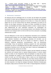-FH – Freedom House (28.2.2022): Freedom in the World 2022 – Myanmar, https://www.ecoi.net/de/dokument/2068763.html, Zugriff 25.8.2022 -HRW – Human Rights Watch (18.3.2022): Myanmar: UN Rights Body Should Advance Justice; Support Arms Embargo, Stronger Targeted Sanctions, https://www.ecoi.net/en/document/2069882.html, Zugriff 25.8.2022 -UNOCHA – UN Office for the Coordination of Humanitarian Affairs (28.6.2022): Myanmar – Humanitarian Update No.19, https://reliefweb.int/report/myanmar/myanmar-humanitarian-update- no-19-28-june-2022, Zugriff 25.8.2022 5. Rechtsschutz / Justizwesen Die Verfassung sieht eine unabhängige Justiz vor, ein Schutz, den das Regime nicht respektiert hat (USDOS 12.4.2022). Nach dem Militärputsch vom Februar 2021 übernahm das Militärregime die Kontrolle über das Justizsystem Myanmars (FH 28.2.2022). Am 4. Februar 2021 entließ das Regime fünf von der NLD ernannte Richter des Obersten Gerichtshofes und ersetzte sie mit Richtern, die das Regime unterstützen. Die übrigen vier Richter, einschließlich des Obersten Richters, sind Überbleibsel der früheren Militärjunta (USDOS 12.4.2022). In Myanmar haben 50 Jahre Militärherrschaft die Justiz systematisch geschwächt, die Unabhängigkeit des Rechtssystems beeinträchtigt und ihr eine Ausrichtung verliehen, die die öffentliche Ordnung und Sicherheit in den Vordergrund stellt. Von 2015 bis 2020 hat sich das Justizsystem nur geringfügig verbessert (BS 23.2.2022). Nach dem Militärputsch von 2021 wurde das Strafgesetzbuch überarbeitet und ein unbefristeter Ausnahmezustand verhängt, der es dem Regime ermöglichte, bestehende Schutzmaßnahmen gegen willkürliche Festnahmen und Inhaftierungen aufzuheben (FH 28.2.2022). Laut der internationalen Juristenkommission gibt es für Tausende von Menschen in Myanmar, die willkürlicher Inhaftierung, gewaltsamem Verschwindenlassen, Folter und Misshandlung, unrechtmäßiger Tötung und gewaltsamer Vertreibung ausgesetzt sind, keine glaubwürdigen Rechtsmittel. Die Justiz ist in überwältigender Weise dem Militär untergeordnet und hat selbst die bescheidenen Fortschritte, die sie in den letzten zehn Jahren in Bezug auf Unabhängigkeit und Effektivität gemacht hatte, verloren (ICJ 10.2.2022). Das Regime verhängte in zahlreichen Gemeinden im ganzen Land das Kriegsrecht und übertrug die richterliche (und exekutive) Macht an regionale Militärkommandeure in mehreren Städten (USDOS 12.4.2022). Vor den Kriegsgerichten haben die Angeklagten nur wenige oder gar keine Rechte, einschließlich des Zugangs zu einem Rechtsbeistand und des Rechts auf Berufung (USDOS 12.4.2022; vgl. AI 25.7.2022) (außer in Fällen, in denen es um die Todesstrafe geht, gegen die beim Oberbefehlshaber der Streitkräfte, Min Aung Hlaing, Berufung eingelegt werden kann). Die Anhörungen werden abgekürzt, das Urteil wird in einer oder zwei Sitzungen gefällt, und die Urteile entsprechen in der Regel den zulässigen Höchststrafen. Öffentlichen Verlautbarungen des Regimes zufolge wurden bis November 2021 61 Fälle vor Kriegsrechtsgerichten verhandelt, in .BFA Bundesamt für Fremdenwesen und Asyl Seite 17 von 55