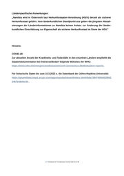 Länderspezifische Anmerkungen: „Namibia wird in Österreich laut Herkunftsstaaten-Verordnung (HStV) derzeit als sicherer Herkunftsstaat geführt. Vom länderkundlichen Standpunkt aus geben die jüngsten Aktuali- sierungen der Länderinformationen zu Namibia keinen Anlass zur Änderung der länder- kundlichen Einschätzung zur Eigenschaft als sicherer Herkunftsstaat im Sinne der HSV." Hinweis: COVID-19: Zur aktuellen Anzahl der Krankheits- und Todesfälle in den einzelnen Ländern empfiehlt die Staatendokumentation bei Interesse/Bedarf folgende Websites der WHO: https://www.who.int/emergencies/diseases/novel-coronavirus-2019/situation-reports. Für historische Daten bis zum 10.3.2023 s. die Datenbank der Johns-Hopkins-Universität: https://gisanddata.maps.arcgis.com/apps/opsdashboard/index.html#/bda7594740fd4029942 3467b48e9ecf6 . .BFA Bundesamt für Fremdenwesen und Asyl Seite 3 von 19