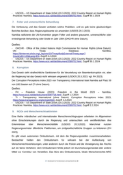 - USDOS – US Department of State [USA] (20.3.2023): 2022 Country Report on Human Rights Practices: Namibia, https://www.ecoi.net/de/dokument/2089702.html, Zugriff 30.1.2024 7. Folter und unmenschliche Behandlung Die Verfassung und das Gesetz verbieten solche Praktiken, und es gab keine glaubwürdigen Berichte darüber, dass Regierungsbeamte sie anwenden (USDOS 20.3.2023). Namibia ratifizierte die UN-Konvention gegen Folter und andere grausame, unmenschliche oder erniedrigende Behandlung oder Strafe im Jahr 1994 (OHCHR ohne Datum). Quellen: - OHCHR - Office of the United Nations High Commissioner for Human Rights (ohne Datum): UN Treaty Database, Namibia, https://tbinternet.ohchr.org/_layouts/15/TreatyBodyExternal/Treaty.aspx? CountryID=120&Lang=EN, Zugriff 6.2.2024 - USDOS – US Department of State [USA] (20.3.2023): 2022 Country Report on Human Rights Practices: Namibia, https://www.ecoi.net/de/dokument/2089702.html, Zugriff 30.1.2024 8. Korruption Das Gesetz sieht strafrechtliche Sanktionen für die Verurteilung von Beamtenkorruption vor, aber die Regierung hat das Gesetz nicht wirksam umgesetzt (USDOS 20.3.2023; vgl. FH 2023). Der Corruption Perceptions Index 2023 von Transparency International listet Namibia auf Platz 59 von 180 Staaten auf (TI ohne Datum). Quellen: - FH – Freedom House (2023): Freedom in the World 2023 – Namibia, https://www.ecoi.net/de/dokument/2097716.html, Zugriff 1.2.2024 - TI – Transparency International (ohne Datum): Corruption Perceptions Index 2023, https://www.transparency.org/en/cpi/2023, Zugriff 2.2.2024 - USDOS – US Department of State [USA] (20.3.2023): 2022 Country Report on Human Rights Practices: Namibia, https://www.ecoi.net/de/dokument/2089702.html, Zugriff 2.2.2024 9. NGOs und Menschenrechtsaktivisten Eine Reihe inländischer und internationaler Menschenrechtsgruppen arbeiteten im Allgemeinen ohne Einschränkungen durch die Regierung und untersuchten und veröffentlichten ihre Erkenntnisse über Menschenrechtsfälle (USDOS 20.3.2023). Manchmal nutzten Regierungsvertreter öffentliche Plattformen, um zivilgesellschaftliche Gruppen zu kritisieren (FH 2023). Es gibt einen autonomen Ombudsmann, mit dem die Regierungsstellen zusammenarbeiteten. Beobachter hielten den Ombudsmann für wirksam bei der Aufdeckung von Menschenrechtsverletzungen, unter anderem durch die Polizei und die Verweigerung des Rechts auf ein faires Verfahren; dem Ombudsmann fehlte jedoch ein Durchsetzungsmandat oder andere Mittel zur Korrektur von Verstößen. Das Büro des Ombudsmanns, lokale Menschenrechts-NRO .BFA Bundesamt für Fremdenwesen und Asyl Seite 8 von 19