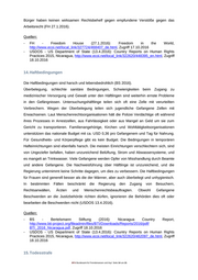.BFA Bundesamt für Fremdenwesen und Asyl Seite 14 von 21 Bürger haben keinen wirksamen Rechtsbehelf gegen empfundene Verstöße gegen das Arbeitsrecht (FH 27.1.2016). Quellen: - FH - Freedom House (27.1.2016): Freedom in the World, http://www.ecoi.net/local_link/327724/468407_de.html, Zugriff 17.10.2016 - USDOS - US Department of State (13.4.2016): Country Reports on Human Rights Practices 2015, Nicaragua, http://www.ecoi.net/local_link/322620/448395_en.html, Zugriff 18.10.2016 14.Haftbedingungen Die Haftbedingungen sind harsch und lebensbedrohlich (BS 2016). Überbelegung, schlechte sanitäre Bedingungen, Schwierigkeiten beim Zugang zu medizinischer Versorgung und Gewalt unter den Häftlingen sind weiterhin ernste Probleme in den Gefängnissen. Untersuchungshäftlinge teilen sich oft eine Zelle mit verurteilten Verbrechern. Wegen der Überbelegung teilen sich jugendliche Gefangene Zellen mit Erwachsenen. Laut Menschenrechtsorganisationen hält die Polizei Verdächtige oft während ihres Prozesses in Arrestzellen, aus Fahrlässigkeit oder aus Mangel an Geld um sie zum Gericht zu transportieren. Familienangehörige, Kirchen und Wohltätigkeitsorganisationen unterstützen das nationale Budget mit ca. USD 0,36 pro Gefangenem und Tag für Nahrung. Für Gesundheits- und Körperpflege gibt es kein Budget. Die Bedingungen in temporären Hafteinrichtungen sind ebenfalls harsch. Die meisten Einrichtungen verschlechtern sich, sind von Ungeziefer befallen, haben unzureichend Belüftung, Strom und Abwassersysteme, und es mangelt an Trinkwasser. Viele Gefangene werden Opfer von Misshandlung durch Beamte und andere Gefangene. Die Nachweisführung über Häftlinge ist unzureichend, und die Regierung unternimmt keine Schritte dagegen, um dies zu verbessern. Die Haftbedingungen für Frauen sind generell besser als die der Männer, aber auch überbelegt und unhygienisch. In bestimmten Fällen beschränkt die Regierung den Zugang von Besuchern, Rechtsanwälten, Ärzten und Menschenrechtsbeauftragten. Obwohl Gefangene Beschwerden an die Justizbehörde richten dürfen, ignorieren die Behörden dies oft oder bearbeiten die Beschwerden nicht (USDOS 13.4.2016). Quellen: - BS - Bertelsmann Stiftung (2016): Nicaragua Country Report, http://www.bti-project.org/fileadmin/files/BTI/Downloads/Reports/2016/pdf/ BTI_2016_Nicaragua.pdf, Zugriff 18.10.2016 - USDOS - US Department of State (13.4.2016): Country Reports on Human Rights Practices 2015, Nicaragua, http://www.ecoi.net/local_link/322620/462097_de.html, Zugriff 18.10.2016 15.Todesstrafe
