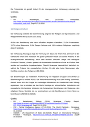 .BFA Bundesamt für Fremdenwesen und Asyl Seite 15 von 21 Die Todesstrafe ist gemäß Artikel 23 der nicaraguanischen Verfassung untersagt (AA 10.2016e). Quellen: - AA - Auswärtiges Amt (10.2016e): Innenpolitik, http://www.auswaertiges-amt.de/DE/Aussenpolitik/Laender/Laenderinfos/Nicaragua/ Innenpolitik_node.html, Zugriff 17.10.2016 16.Religionsfreiheit Die Verfassung verbietet die Diskriminierung aufgrund der Religion und legt Glaubens- und Religionsfreiheit fest (USDOS 10.8.2016). 58,5% der Bevölkerung sind nach offiziellen Angaben Katholiken, 23,2% Protestanten, 15,7% ohne Bekenntnis, 0,9% Zeugen Jehovas und 1,6% anderen Religionen zugehörig (CIA 27.10.2016). Die Verfassung Nicaraguas legt die Trennung von Staat und Kirche fest. Dennoch ist die katholische Kirche eine Institution mit großer politischer Macht und starker Präsenz in der nicaraguanischen Bevölkerung. Nach dem Bündnis zwischen Ortega und Managuas Erzbischof Ovando y Bravo, gewann die konservative katholische Kirche an Einfluss über soziale und moralische Angelegenheiten. Obwohl Nicaragua hauptsächlich katholisch ist, wächst die Präsenz der evangelischen Kirchen. Es gibt aber keine Spannungen oder Konflikte zwischen den Religionen (BS 2016). Die Bestimmungen zur rechtlichen Anerkennung von religiösen Gruppen sind ähnlich zu Bestimmungen für andere NGOs. Die Nationalversammlung muss dem Antrag zustimmen, danach muss sich die Gruppe im zuständigen Ministerium als Gesellschaft oder Stiftung registrieren. Nur so erhalten sie das Recht Verträge etc. abzuschließen. Katholische und evangelische Kirchenobere kritisierten die fortgesetzten Bemühungen der Regierung, den religiösen Klerus, Symbole etc. zu vereinnahmen um die Bevölkerung in ihrem Sinne zu beeinflussen (USDOS 10.8.2016). Quellen: - BS - Bertelsmann Stiftung (2016): Nicaragua Country Report, http://www.bti-project.org/fileadmin/files/BTI/Downloads/Reports/2016/pdf/ BTI_2016_Nicaragua.pdf, Zugriff 21.10.2016 - CIA - Central Intelligence Agency (27.10.2016): The World Factbook - Nicaragua, https://www.cia.gov/library/publications/the-world-factbook/geos/nu.html, Zugriff 31.10.2016 - USDOS - US Department of State (10.8.2016): Report on International Religious Freedom - Nicaragua, http://www.ecoi.net/local_link/328472/469249_de.html, Zugriff 19.10.2016