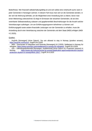 Bedürfnisse. Wer finanziell selbsterhaltungsfähig ist und sich selbst eine Unterkunft sucht, kann in jeder Gemeinde in Norwegen wohnen. In diesem Fall muss man sich an die Gemeinde wenden, in der sich die Wohnung befindet, um die Möglichkeit einer Ansiedlung dort zu klären, bevor man einen Mietvertrag unterzeichnet. Es liegt im Ermessen der einzelnen Gemeinden, ob sie eine vereinbarte Selbstansiedlung zulassen und gegebenenfalls Beschränkungen für die Anzahl solcher Vereinbarungen auferlegen. Um am Einführungsprogramm teilnehmen zu können und Einführungsgeld sowie andere finanzielle Leistungen von der Gemeinde zu erhalten, muss die Ansiedlung durch eine Vereinbarung zwischen der Gemeinde und dem Staat (IMDI) erfolgen (IMDI 4.2.2025). Quellen: - Asylinfo [Norwegen] (ohne Datum): You are allowed to stay in Norway (positive answer), https://asylinfo.no/Asylum, Zugriff 24.6.2025 - IMDI - Directorate of Integration and Diversity [Norwegen] (4.2.2025): Settlement in Norway for refugees, https://www.nyinorge.no/en/settlement-in-norway-for-refugees/, Zugriff 25.6.2025 - UDI – Utlendingsdirektoratet [Norwegen, Asylbehörde] (ohne Datum m): Protection (asylum) in Norway , https://www.udi.no/en/received-an-answer/application-approved/protection-asylum/ protection-asylum-in-norway/#link-15917, Zugriff 24.6.2025 FA Bundesamt für Fremdenwesen und Asyl Seite 12 von 12