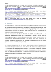 - USDOS – US Department of State [USA] (12.4.2022): 2021 Country Report on Human Rights Practices: Israel, West Bank and Gaza - West Bank and Gaza, https://www.ecoi.net/de/dokument/2071205.html, Zugriff 24.5.2022 11. Wehrdienst und Rekrutierungen Gemäß den Osloer Abkommen ist der Palästinensischen Autonomiebehörde (PA) kein konventionelles Militär erlaubt, sie unterhält jedoch Sicherheits- und Polizeikräfte (CIA 16.5.2022). Es gibt keine Wehrpflicht (USDOL 29.9.2021). Anm.: Die Rekrutierung durch bewaffnete Gruppen ist nicht Gegenstand des Kapitels und kann bei Bedarf im Rahmen von Anfragebeantwortungen recherchiert werden. Quellen: - CIA – Central Intelligence Agency [USA] (Stand: 16.5.2022): The World Factbook – West Bank, https://www.cia.gov/the-world-factbook/countries/west-bank/#military-and-security, Zugriff 24.5.2022 - USDOL – US Department of Labor [USA] (29.9.2021): 2020 Findings on the Worst Forms of Child Labor: West Bank and Gaza Strip, https://www.ecoi.net/de/dokument/2061993.html, Zugriff 24.5.2022 12. Allgemeine Menschenrechtslage Im Februar 2021 entschied der Internationale Strafgerichtshof, dass er Jurisdiktion über schwere Verbrechen in den besetzten palästinensischen Gebieten hat, und im März folgte die Eröffnung einer formalen Ermittlung zur dortigen Lage (HRW 13.1.2022). Die israelische Militärbesatzung des Westjordanlandes bringt schwerwiegende physische Barrieren und Einschränkungen der Bewegungsfreiheit mit sich, ebenso wie den Abriss von Häusern und anderen Bauten, Restriktionen der politischen Rechte und bürgerlichen Freiheiten sowie eine Ausweitung israelischer Siedlungen, die verbreitet als Verletzung des Völkerrechts gelten. Mit Stand 2021 gab es ungefähr 700.000 jüdische Siedler im Westjordanland, einschließlich Ost-Jerusalem, welche israelische Staatsbürger mit vollen politischen Rechten in Israel sind (FH 28.2.2022). Mit Stand 1.10.2022 hielt Israel 4.4.60 PalästinenserInnen für sicherheitsbezogene Straftaten fest, darunter 200 Kinder – viele für Steinewerfen – sowie 492 Personen in Administrativhaft ohne formale Anklage oder Prozeß und basierend auf geheimen Beweisen. Die meisten palästinensischen Gefangenen wurden im Staat Israel festgehalten, was Besuche durch Familienangehörige kompliziert, und gegen das Völkerrecht verstößt, das den Transfer außerhalb eines besetzten Gebiets untersagt (HRW 13.1.2022). Anm.: Nähere Informationen zu den menschenrechtlichen Auswirkungen der israelischen Politik sind auch in den jeweiligen anderen Kapiteln des Länderinformationsblatts zu finden. .BFA Bundesamt für Fremdenwesen und Asyl Seite 26 von 52