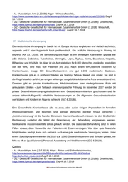 - AA - Auswärtiges Amt (4.2018b): Niger - Wirtschaftspolitik, https://www.auswaertiges-amt.de/de/aussenpolitik/laender/niger-node/wirtschaft/226386, Zugriff 13.7.2018 - GIZ - Deutsche Gesellschaft für Internationale Zusammenarbeit GmbH (6.2018b): Gesellschaft, https://www.liportal.de/niger/gesellschaft/, Zugriff 16.7.2018 - GIZ - Deutsche Gesellschaft für Internationale Zusammenarbeit GmbH (7.2018): Wirtschaft, https://www.liportal.de/niger/wirtschaft-entwicklung/, Zugriff 16.7.2018 17. Medizinische Versorgung Die medizinische Versorgung im Lande ist mit Europa nicht zu vergleichen und vielfach technisch, apparativ und / oder hygienisch hoch problematisch. Die ärztliche Versorgung in Niamey ist begrenzt (AA 13.7.2018). Die Bevölkerung des Niger ist von vielfältigen Krankheiten geplagt wie z.B.: Malaria, Gelbfieber, Tuberkulose, Meningitis, Lepra, Typhus, Noma, Brucellose, Hepatitis, Bilharziose und HIV/Aids. Im Niger ist ein Arzt statistisch für 9.000 Menschen zuständig; empfohlen von der WHO sind max. 600 Patienten pro Arzt. Nach einem WHO-Bericht existieren 42 Krankenhäuser, knapp 600 Gesundheitszentren und gut 1.000 medizinische Stationen. Krankenhäuser gibt es in größeren Städten wie Niamey, Tahoua, Maradi und Zinder. Sie sind in der Regel staatlich geführt; an einigen wirken gut ausgebildete kubanische Ärzte unterstützend mit. Daneben gibt es private Krankenhäuser, Medizinstationen oder niedergelassene Ärzte mit ambulanten Kliniken – zum Teil auch unter europäischer Führung. Im November 2017 wurden 14 private Gesundheitsversorgungsinstitutionen vom Gesundheitsministerium geschlossen und für andere stehen Auflagen für erhebliche Verbesserungen an. Die allgemeine Gesundheitssituation von Müttern und Kindern im Niger ist schlecht (GIZ 6.2018b). Eine Gesundheits-/Krankenkasse gibt es zwar, aber außer einigen Angestellten in formellen Arbeitsverhältnissen und Beamten sind wenige Menschen darüber hinaus versichert - „Sozialversicherung“ ist die Familie. Bei einem Krankenhausbesuch müssen für den Großteil der Bevölkerung zunächst die Mittel der Finanzierung der Behandlung vorgewiesen werden. Medikamente müssen ebenfalls selbst gekauft werden. Die stationäre Behandlung setzt in vielen Fällen voraus, dass Verwandte den Patienten mit Essen versorgen. Wer über gute finanzielle Möglichkeiten verfügt, kann sich natürlich auch eine gute medizinische Versorgung leisten. Unter einem Spezialprogramm wurden bis 2010 u.a. 1.000 Gesundheitszentren und Schulen gebaut, nur fehlt es oft an (qualifiziertem) Personal, Ausstattung und Medikamenten (GIZ 6.2018b). Quellen: - AA - Auswärtiges Amt (13.7.2018): Niger - Reise- und Sicherheitshinweise, http://www.auswaertiges-amt.de/DE/Laenderinformationen/00-SiHi/Nodes/ NigerSicherheit_node.html, Zugriff 13.7.2018 - GIZ - Deutsche Gesellschaft für Internationale Zusammenarbeit GmbH (6.2018b): Gesellschaft, https://www.liportal.de/niger/gesellschaft/, Zugriff 16.7.2018 .BFA Bundesamt für Fremdenwesen und Asyl Seite 16 von 17