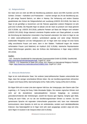 12. Religionsfreiheit Der Islam wird von mehr als 98% der Bevölkerung praktiziert, davon sind 95% Sunniten und 5% Schiiten. Christen – Katholiken und Protestanten – machen weniger als 2% der Bevölkerung aus. Es gibt einige Tausend Baha‘is, vor allem in Niamey. Die Verfassung und andere Gesetze gewährleisten den Schutz der Religionsfreiheit und -ausübung (USDOS 29.5.2018). Der Islam im Niger ist als gemäßigt zu bezeichnen und die Toleranz gegenüber anderen Religionen ist sehr groß (GIZ 6.2018b). Die Republik Niger ist säkular und der Islam ist juristisch vom Staat getrennt (GIZ 6.2018b, vgl. USDOS 29.5.2018), politische Parteien auf Basis der Religion sind verboten (USDOS 29.5.2018). Einige islamisch orientierte Projekte werden vom Staat gefördert; so wurde die Einrichtung der Islamischen Universität in Say finanziell unterstützt. Der Islam im Niger ist, wie in vielen (west-)afrikanischen Ländern, synkretistisch geprägt und weist einige Elemente traditioneller Religionen und des Volksglaubens auf. Im Niger sieht man wenige mit einer Burka völlig verschleierte Frauen und wenn, dann in den Städten. Traditionell tragen die meisten verheirateten Frauen (und Mädchen) ein Kopftuch (GIZ 6.2018b). Islamische Repräsentanten haben Befürchtungen geäußert, dass der Einfluss des Wahhabismus in Niger steigt (USDOS 29.5.2018). Quellen: - GIZ - Deutsche Gesellschaft für Internationale Zusammenarbeit GmbH (6.2018b): Gesellschaft, https://www.liportal.de/niger/gesellschaft/, Zugriff 16.7.2018 - USDOS - U.S. Department of State (29.5.2018): 2017 Report on International Religious Freedom - Niger, https://www.ecoi.net/en/document/1436811.html, Zugriff 16.7.2018 13. Ethnische Minderheiten Niger ist ein multi-ethnischer Staat. Von anderen (west-)afrikanischen Staaten unterscheidet den Niger, dass hier weniger verschiedene Ethnien leben. Die vier bevölkerungsreichsten ethnischen Gruppen sind Hausa (53%), Djerma/Songhai (21%), Fulbe (10%), Tuareg (10%) (GIZ 6.2018a). Ein Nigrer fühlt sich in erster Linie dem eigenen Volk bzw. der Untergruppe, dem Stamm oder Clan zugehörig: z. B. Tuareg Kel Ewey, Fulbe Woodaabe Djidjiru. Die meisten nigrischen Ethnien sind nicht auf die (künstlichen) nationalstaatlichen Grenzen festgelegt, es existieren grenzüberschreitende alte Verbindungen, sowohl bei Haussa (gen Nigeria), Songhai (gen Mali), Tuareg als auch Fulbe, um nur die vier bevölkerungsreichsten Ethnien zu nennen. Da eine gemeinsame Sprache mit regionalen Unterschieden gesprochen wird, kann man miteinander kommunizieren; denn Sprache ist nicht nur ein verbindendes, sondern auch identitätsstiftendes Kriterium. Das Nationalgefühl ist im Niger nicht sehr stark ausgeprägt, sondern zeigt sich eher, wenn Nigrer im Ausland in der Diaspora leben (GIZ 6.2018a). .BFA Bundesamt für Fremdenwesen und Asyl Seite 12 von 17