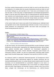 Das Gesetz verbietet Kinderpornografie und sieht eine Strafe von sechs bis zwölf Jahren Haft und eine Geldstrafe vor. Es verbietet weiter den sexuellen Kinderhandel und sieht eine Strafe von zwölf bis 20 Jahren Gefängnis vor, wenn das Opfer 14 bis 17 Jahre alt ist, und mindestens 25 Jahre, wenn das Opfer 13 Jahre oder jünger ist. Regierungsbeamte und Nichtregierungsorganisationen stellten im Laufe des Jahres 2022 zahlreiche Fälle von Kindersexhandel fest, obwohl die Beamten viele Verbrechen des Kindersexhandels weiterhin als sexuelle Ausbeutung einstuften, was den Opfern weniger Schutz bietet. Obwohl das Land über strenge Gesetze zum Schutz von Kindern verfügt, hat die Regierung die Gesetze nicht wirksam durchgesetzt (USDOS 20.3.2023). In Peru machen Kinder unter 15 Jahren einen großen Teil der Bevölkerung aus. Gefährdete Kinder und Jugendliche sind mit vielen Herausforderungen konfrontiert: Sie leben in Armut und sind von Gewalt, Missbrauch und Unterernährung betroffen. Viele dieser Kinder sind gezwungen, die Schule frühzeitig abzubrechen (SOS o.D.). Quellen: - KW - Kinderweltreise (1.8.2023): Schule in Peru, https://www.kinderweltreise.de/kontinente/suedamerika/peru/alltag-kinder/schule-in-peru/, Zugriff 3.10.2023 - SOS - SOS Kinderdorf (o.D.): Wo wir helfen - Peru, https://www.sos-kinderdorf.de/portal/spenden/wo-wir-helfen/amerika/peru, Zugriff 3.10.2023 -USDOS - U.S: Department of State [USA] (20.3.2023): 2022 Country Report on Human Rights Practices: Peru, https://www.ecoi.net/de/dokument/2089223.html, Zugriff 25.9.2023 15.3. Homosexuelle/Sexuelle Minderheiten Es gibt keine Gesetze, die einvernehmliche gleichgeschlechtliche sexuelle Handlungen zwischen Erwachsenen unter Strafe stellen. Organisationen der Zivilgesellschaft berichten, dass auf lokaler Ebene geltende Vorschriften gegen "Unsittlichkeit" und "Herumlungern" gelegentlich in unverhältnismäßiger Weise Lesben, Schwule, Bisexuelle, Transgender, queere Personen und Intersexuelle (LGBTQI+) betreffen, und dass die missbräuchliche Anwendung lokaler Gesetze gegen Straßen-Sexarbeit häufiger gegen Transgender-Frauen gerichtet ist (USDOS 20.3.2023). Die Verfassung enthält ein umfassendes Diskriminierungsverbot, und Einzelpersonen können rechtliche Ansprüche wegen Diskriminierung aufgrund der sexuellen Ausrichtung oder der Geschlechtsidentität geltend machen. Nur wenige nationale Gesetze erwähnen jedoch die sexuelle Ausrichtung und die Geschlechtsidentität als ausdrückliche Kategorien für den Schutz vor Diskriminierung, was Raum für Interpretationen lässt, die die Rechte von LGBTQI+-Personen außer Acht lassen. Einige Regionen und Gemeinden, darunter La Libertad, Loreto, Piura und San Martín, verfügten über Verordnungen, die die Diskriminierung von LGBTQI+-Personen .BFA Bundesamt für Fremdenwesen und Asyl Seite 19 von 24