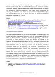 Ruanda - aus Sicht des UNDP (United Nation Development Programme) - die Millennium- Entwicklungsziele erreicht. Auch im Bereich der Bekämpfung von Malaria sind Erfolge zu verzeichnen. Malaria ist zwar noch weit verbreitet, rangiert jedoch inzwischen - im Hinblick auf Häufigkeit und Ursache von Sterbefällen - hinter Grippe, Masern, Erkrankungen der Atemwege, Hautinfektionen sowie Magen- und Darmerkrankungen. Die HIV-Prävalenz an der Gesamtbevölkerung wird mit drei Prozent angegeben; sie ist unter der städtischen Bevölkerung am höchsten (GIZ 9.2017c). Quellen: - AA - Auswärtiges Amt (20.2.2018): Ruanda - Landesspezifische Sicherheitshinweise, https://www.auswaertiges-amt.de/de/aussenpolitik/laender/ruanda-node/ ruandasicherheit/212026#content_0, Zugriff 20.2.2018 - BMEIA - Bundesministerium für Europa Integration und Äußeres (20.2.2018): Reiseinformation – Ruanda, https://www.bmeia.gv.at/reise-aufenthalt/reiseinformation/land/ruanda/, Zugriff 20.2.2018 - GIZ - Deutsche Gesellschaft für internationale Zusammenarbeit GmbH (9.2017c): Ruanda – Gesellschaft, https://www.liportal.de/ruanda/gesellschaft/, Zugriff 21.2.2018 20.Behandlung nach Rückkehr Die Regierung arbeitet allgemein mit dem UN-Hochkommissar für Flüchtlinge (UNHCR) und anderen humanitären Organisationen zusammen, um für die Bereitstellung von Schutz und Hilfe für Binnenvertriebene, Flüchtlinge, rückkehrende Flüchtlinge, Asylsuchende, Staatenlose und andere Personen zu sorgen. Nach Angaben des UNHCR, hat die Regierung die Rückkehr aus anderen Ländern von 2011 bis Oktober 2014 von mehr als 27.000 Angehörigen akzeptiert und unterstützt. Die meisten ließen sich in ihren Herkunftsbezirken nieder. Die Regierung akzeptiert auch die Rückkehr ehemaliger ruandischer Kämpfer aus der DR Kongo. Die ruandische Demobilisierungs- und Wiedereingliederungskommission betreibt mit internationaler Unterstützung ein dreimonatiges Umerziehungsprogramm im Mutobo Demobilisierung Zentrum für ehemalige Kämpfer. Nach diesem Zeitraum wurden erwachsene ehemalige Kämpfer automatisch als RDF (Rwandan Defence Forces)-Reservekräfte eingeschrieben. Sie erhielten je rund 60.000 ruandischen Francs ($ 74) und die Erlaubnis nach Hause zurückzukehren. Das Musanze Child Rehabilitation Center, das 2015 aus der Ostprovinz umgesiedelt wurde, betreut nun ehemalige Kindersoldaten in der Nordprovinz (USDOS 3.3.2017). Quellen: - USDOS - U.S. Department of State (3.3.2017): Country Report on Human Rights Practices 2016 - Rwanda, https://www.ecoi.net/en/document/1395590.html, Zugriff 20.2.2018 .BFA Bundesamt für Fremdenwesen und Asyl Seite 19 von 20
