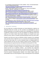 9. Wehrdienst und Rekrutierungen Es gibt keine Wehrpflicht; Personen im Alter zwischen 18 und 26 Jahren können freiwillig in den Militärdienst eintreten (CIA 2.12.2021). Quellen: - CIA - Central Intelligence Agency [USA] (2.12.2021): The World Factbook – South Africa, https://www.cia.gov/the-world-factbook/countries/south-africa/, Zugriff 22.12.2021 10. Allgemeine Menschenrechtslage Zu den signifikantesten Menschenrechtsvergehen zählen u.a.: Ungesetzliche und willkürliche Tötungen durch Sicherheitskräfte; Folter und Fälle grausamer und unmenschlicher Behandlung oder Bestrafung; harte und lebensbedrohende Haftbedingungen; und willkürliche Verhaftungen (USDOS 30.3.2021). Manchmal kommt es zu Mob-Justiz, manchmal setzt die Polizei übermäßige Gewalt ein, um Kriminalität zu bekämpfen und öffentliche Unruhen einzudämmen (CRS 17.9.2020). Auch wenn einige Fälle von durch Staatsvertreter begangene Menschenrechtsverbrechen untersucht und zur Verurteilung gebracht worden sind, gibt es zahlreiche Berichte über Straflosigkeit. Problematisch ist außerdem, dass nur wenige Täter wegen politischer Gewalt verurteilt werden. Nach Angaben von NGOs ist ein Großteil der Morde auf Konflikte innerhalb der Regierungspartei ANC zurückzuführen; als Motive gelten der Wettstreit um Ressourcen oder die Rache an Whistleblowern bei Korruptionsfällen (USDOS 30.3.2021). Die Verfassung und die Gesetze verbieten willkürliche Verhaftungen. Die Regierung achtet diese Verbote im Allgemeinen auch in der Praxis. Trotzdem gibt es Fälle willkürlicher Verhaftungen – v.a. hinsichtlich Gastarbeitern, Asylwerbern und Flüchtlingen. Manchmal werden die Verhafteten zu Schmiergeldzahlungen erpresst. Außerdem verhaftet die Polizei immer wieder Menschen, die sich geringfügiger Vergehen schuldig gemacht haben, für welche eine Verhaftung nicht vorgesehen ist – z.B. fehlende Identitätsdokumente oder Bagatelldiebstahl (USDOS 30.3.2021). Wegen Verletzung des Lockdowns waren im Jahr 2020 hunderttausende Menschen verhaftet (CRS 17.9.2020). Die Nationale Menschenrechtskommission bearbeitete 2017/18 v.a. Fälle aus folgenden Bereichen: Gleichberechtigung (14 Prozent); Gesundheits-, Lebensmittel-, Wasserversorgung und soziale Sicherheit (9 Prozent); ungerechte Verwaltungsakte (9 Prozent); Arbeitsrecht (8 Prozent); und Menschenwürde (8 Prozent). Ein Volksanwalt (Public Protector) bearbeitete ebenfalls Vorbringen von Bürgern (GOS 23.7.2021). Südafrika beherbergt eine sehr lebendige Zivilgesellschaft. NGOs können sich ohne Probleme registrieren lassen und agieren (FH 3.3.2021), es gibt keine signifikanten rechtlichen .BFA Bundesamt für Fremdenwesen und Asyl Seite 15 von 31