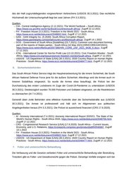 Einschränkungen (ICNL 13.10.2021). Der Gesetzgeber geht regelmäßig auf Vorschläge von NGOs ein (FH 3.3.2021). Die Verfassung und die Gesetze sehen Versammlungs- und Vereinigungsfreiheit vor. Die Regierung respektiert diese Rechte auch in der Praxis (USDOS 30.3.2021; vgl. FH 3.3.2021). Anders als in früheren Jahren müssen Proteste jetzt nicht mehr vorab bei lokalen Behörden angekündigt werden; allerdings berichten NGOs, dass derartige Ankündigungen von vielen Gemeinden nach wie vor eingefordert werden (USDOS 30.3.2021). Nach anderen Angaben müssen Demonstrationen nach wie vor angekündigt werden, diese werden aber nur sehr selten untersagt (FH 3.3.2021). Es gibt keine Meldungen hinsichtlich politischer Gefangener (USDOS 30.3.2021). Allerdings kommt es immer wieder zu politisch motivierten Morden. Seit 2015 hat es alleine in der Provinz KwaZulu-Natal mehr als 90 solcher Morde gegeben (FH 3.3.2021). Quellen: - CRS - Congressional Research Service [USA] (17.9.2020): South Africa – Current Issues, Economy, and U.S. Relations, https://crsreports.congress.gov/product/pdf/R/R45687, Zugriff 14.1.2022 - FH - Freedom House (3.3.2021): Freedom in the World 2021 - South Africa, https://www.ecoi.net/de/dokument/2048602.html, Zugriff 17.12.2021 - GOS - Government of South Africa [Südafrika] (23.7.2021): Common core document forming part of the reports of States parties - South Africa [10 May 2021] [HRI/CORE/ZAF/2021], https://www.ecoi.net/en/file/local/2057386/HRI_CORE_ZAF_2021_9436_E.docx, Zugriff 17.12.2021 - ICNL - International Center for Not-for-Profit Law (13.10.2021): Civic Freedom Monitor - South Africa, https://www.icnl.org/resources/civic-freedom-monitor/south-africa, Zugriff 17.12.2021 - USDOS - US Department of State [USA] (30.3.2021): 2020 Country Report on Human Rights Practices - South Africa, https://www.ecoi.net/de/dokument/2048477.html, Zugriff 17.12.2021 11. Meinungs- und Pressefreiheit Die Verfassung und die Gesetze sehen Meinungs- und Pressefreiheit vor. Die Regierung respektiert diese Rechte im Allgemeinen auch in der Praxis. Es gibt eine aktive und unabhängige Presse, die eine breites Spektrum an Meinungen abbildet (USDOS 30.3.2021; vgl. FH 3.3.2021; GAN 5.2020). Auch Bürger können sich frei über die Politik äußern, ohne Belästigungen fürchten zu müssen (FH 3.3.2021). Einige Gesetze ermöglichen es den Behörden, die Pressefreiheit hinsichtlich der Berichterstattung zu Sicherheitskräften, Gefängnisse und Psychiatrien einzuschränken. Zudem ist die Verbreitung von Falschnachrichten (fake news) hinsichtlich der Covid-19-Pandemie unter Strafe gestellt worden (USDOS 30.3.2021), das Strafausmaß umfasst Haftstrafen (RSF 20.4.2021). In Einzelfällen wurden Journalisten von Behörden der Gewalt, Belästigung oder Einschüchterung ausgesetzt (USDOS 30.3.2021; vgl. FH 3.3.2021). Die Regierung und politische Vertreter .BFA Bundesamt für Fremdenwesen und Asyl Seite 16 von 31