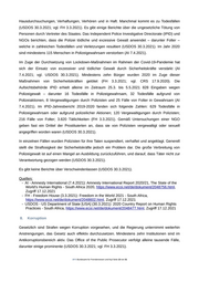 des der Haft zugrundeliegenden vorgeworfenen Verbrechens (USDOS 30.3.2021). Das rechtliche Höchstmaß der Untersuchungshaft liegt bei zwei Jahren (FH 3.3.2021). Quellen: - CIA - Central Intelligence Agency (2.12.2021): The World Factbook – South Africa, https://www.cia.gov/the-world-factbook/countries/south-africa/, Zugriff 22.12.2021 - FH - Freedom House (3.3.2021): Freedom in the World 2021 - South Africa, https://www.ecoi.net/de/dokument/2048602.html, Zugriff 17.12.2021 - GAN - GAN Integrity Inc. (5.2020): South Africa Corruption Report, https://www.ganintegrity.com/portal/country-profiles/south-africa/, Zugriff 14.1.2022 - GOS - Government of South Africa [Südafrika] (23.7.2021): Common core document forming part of the reports of States parties - South Africa [10 May 2021] [HRI/CORE/ZAF/2021], https://www.ecoi.net/en/file/local/2057386/HRI_CORE_ZAF_2021_9436_E.docx, Zugriff 17.12.2021 - ICNL - International Center for Not-for-Profit Law (13.10.2021): Civic Freedom Monitor - South Africa, https://www.icnl.org/resources/civic-freedom-monitor/south-africa, Zugriff 17.12.2021 - USDOS - US Department of State [USA] (30.3.2021): 2020 Country Report on Human Rights Practices - South Africa, https://www.ecoi.net/de/dokument/2048477.html, Zugriff 17.12.2021 6. Sicherheitsbehörden Das South African Police Service trägt die Hauptverantwortung für die innere Sicherheit, die South African National Defense Force jene für die äußere Sicherheit. Allerdings wird die Armee auch im Inneren Südafrikas eingesetzt. So wurde die Armee etwa beauftragt, die Polizei bei der Durchsetzung des ersten Lockdowns im Zuge der Covid-19-Pandemie zu unterstützen (USDOS 30.3.2021). Diesbezüglich wurden 76.000 Polizisten und Soldaten eingesetzt, um die Restriktionen zu überwachen (AI 7.4.2021). Generell üben zivile Behörden eine effektive Kontrolle über die Sicherheitskräfte aus (USDOS 30.3.2021). Die Armee ist professionell und hält sich im Allgemeinen aus politischen Angelegenheiten heraus (FH 3.3.2021). Die Polizei ist ausreichend finanziert (CRS 17.9.2020). Quellen: - AI - Amnesty International (7.4.2021): Amnesty International Report 2020/21, The State of the World's Human Rights - South Africa 2020, https://www.ecoi.net/de/dokument/2048756.html, Zugriff 17.12.2021 - CRS - Congressional Research Service [USA] (17.9.2020): South Africa – Current Issues, Economy, and U.S. Relations, https://crsreports.congress.gov/product/pdf/R/R45687, Zugriff 14.1.2022 - FH - Freedom House (3.3.2021): Freedom in the World 2021 - South Africa, https://www.ecoi.net/de/dokument/2048602.html, Zugriff 17.12.2021 - USDOS - US Department of State [USA] (30.3.2021): 2020 Country Report on Human Rights Practices - South Africa, https://www.ecoi.net/de/dokument/2048477.html, Zugriff 17.12.2021 7. Folter und unmenschliche Behandlung Die Verfassung und die Gesetze verbieten Folter und unmenschliche Behandlung oder Bestrafung. Trotzdem gibt es Folter- und Gewaltvorwürfe gegen die Polizei. Derartige Vorfälle ereignen sich bei .BFA Bundesamt für Fremdenwesen und Asyl Seite 12 von 31