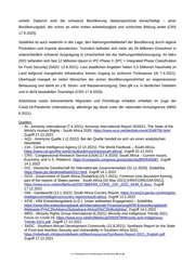 verteilt. Dadurch wird die schwarze Bevölkerung überproportional benachteiligt – jener Bevölkerungsteil, der schon an einer hohen Arbeitslosigkeit und schlechter Bildung leidet (CRS 17.9.2020). Südafrika ist auch weiterhin in der Lage, den Nahrungsmittelbedarf der Bevölkerung durch eigene Produktion und Importe abzudecken. Trotzdem befinden sich mehr als 29 Millionen Einwohner in unterschiedlich schwerer Ausprägung in Unsicherheit bei der Nahrungsmittelversorgung. Im März 2021 befanden sich fast 12 Millionen davon in IPC-Phase 3 [IPC = Integrated Phase Classification for Food Security] (SADC 12.8.2021). Laut staatlichen Angaben haben 5,5 Millionen Haushalte im Land aufgrund mangelnder Infrastruktur keinen Zugang zu sicherem Trinkwasser (AI 7.4.2021). Überhaupt mangelt es vielen Menschen der armen Bevölkerungsmehrheit an angemessener Behausung und damit an z.B. Strom- und Wasserversorgung. Dies gilt v.a. in ländlichen Gebieten und in dicht besiedelten Townships (CRS 17.9.2020). Arbeitslose sowie dokumentierte Migranten und Flüchtlinge erhielten erhielten im Zuge der Covid-19-Pandemie Unterstützung; allerdings lag diese unter der nationalen Armutsgrenze (MRG 6.2021). Quellen: - AI - Amnesty International (7.4.2021): Amnesty International Report 2020/21, The State of the World's Human Rights - South Africa 2020, https://www.ecoi.net/de/dokument/2048756.html, Zugriff 17.12.2021 - AQ1 - Anonyme Quelle 1 (1.2022): Bei der Quelle handelt es sich um einen analytischen Newsletter - CIA - Central Intelligence Agency (2.12.2021): The World Factbook – South Africa, https://www.cia.gov/the-world-factbook/countries/south-africa/, Zugriff 22.12.2021 - CRS - Congressional Research Service [USA] (17.9.2020): South Africa – Current Issues, Economy, and U.S. Relations, https://crsreports.congress.gov/product/pdf/R/R45687, Zugriff 14.1.2022 - GIZ - Deutsche Gesellschaft für Internationale Zusammenarbeit (31.12.2020): Südafrika, https://www.giz.de/de/weltweit/312.html, Zugriff 14.1.2022 - GOS - Government of South Africa [Südafrika] (23.7.2021): Common core document forming part of the reports of States parties - South Africa [10 May 2021] [HRI/CORE/ZAF/2021], https://www.ecoi.net/en/file/local/2057386/HRI_CORE_ZAF_2021_9436_E.docx, Zugriff 17.12.2021 - GW - Gardaworld (13.1.2022): South Africa Country Report, https://crisis24.garda.com/insights- intelligence/intelligence/country-reports/south-africa, Zugriff 13.1.2022 - KFW - KfW Entwicklungsbank (o.D.): Unser weltweites Engagement – Südafrika, https://www.kfw-entwicklungsbank.de/Internationale-Finanzierung/KfW-Entwicklungsbank/ Weltweite-Pr%C3%A4senz/Subsahara-Afrika/S%C3%Bcdafrika/, Zugriff 14.1.2022 - MRG - Minority Rights Group International (6.2021): Minority and Indigenous Trends 2021, Focus on Covid-19, https://www.ecoi.net/en/file/local/2055978/Minority-and-Indigenous- Trends-2021.pdf, Zugriff 17.12.2021 - SADC - Southern African Development Community (12.8.2021): Synthesis Report on the State of Food and Nutrition Security and Vulnerability in Southern Africa 2021, https://reliefweb.int/sites/reliefweb.int/files/resources/Synthesis-Report-2021_English.pdf, Zugriff 17.12.2021 .BFA Bundesamt für Fremdenwesen und Asyl Seite 29 von 31