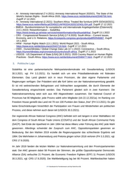 - AI - Amnesty International (7.4.2021): Amnesty International Report 2020/21, The State of the World's Human Rights - South Africa 2020, https://www.ecoi.net/de/dokument/2048756.html, Zugriff 17.12.2021 - AI - Amnesty International (2.2021): Southern Africa: Treated like furniture [AFR 03/3418/2021], https://www.ecoi.net/en/file/local/2045021/AFR0334182021ENGLISH.pdf, Zugriff 17.12.2021 - BMEIA - Bundesministerium für europäische und internationale Angelegenheiten [Österreich] (13.1.2022): Reiseinformation – Südafrika, https://www.bmeia.gv.at/reise-services/reiseinformation/land/suedafrika/, Zugriff 13.1.2022 - CRS - Congressional Research Service [USA] (17.9.2020): South Africa – Current Issues, Economy, and U.S. Relations, https://crsreports.congress.gov/product/pdf/R/R45687, Zugriff 14.1.2022 - HRW - Human Rights Watch (13.1.2021): World Report 2021 - South Africa, https://www.ecoi.net/de/dokument/2043719.html, Zugriff 17.12.2021 - OWD - Ourworldindata / Global Change Data Lab (17.1.2022): Coronavirus – South Africa, https://ourworldindata.org/coronavirus/country/south-africa, Zugriff 17.1.2022 - USDOS - US Department of State [USA] (30.3.2021): 2020 Country Report on Human Rights Practices - South Africa, https://www.ecoi.net/de/dokument/2048477.html, Zugriff 17.12.2021 3. Politische Lage Südafrika ist eine parlamentarische Mehrparteiendemokratie mit Gewaltenteilung (USDOS 30.3.2021; vgl. FH 3.3.2021). Es handelt sich um eine Präsidialdemokratie mit föderalen Elementen. Das Land gliedert sich in neun Provinzen, die über eigene Parlamente und Regierungen verfügen. Der Präsident wird alle fünf Jahre von der Nationalversammlung gewählt. Er ist mit weitreichenden Befugnissen und Vollmachten ausgestattet, die durch Elemente der Gewaltenteilung eingeschränkt werden. Das Parlament gliedert sich in zwei Kammern: Die Nationalversammlung setzt sich aus 400 Abgeordneten zusammen. Der National Council of Provinces hat 90 Mitglieder; jede Provinz wählt zehn Mitglieder (AA 22.12.2021a). Im Ranking von Freedom House genießt das Land mit 79 von 100 Punkten den Status „free“ (FH 3.3.2021). Es gibt keine Einschränkungen hinsichtlich der Partizipation von Frauen und Minderheiten am politischen Prozess, und diese nehmen auch daran teil (USDOS 30.3.2021). Der regierende African National Congress (ANC) befindet sich seit langem in einer Wahlallianz mit dem Congress of South African Trade Unions (COSATU) und der South African Communist Party (SACP). Seit Ende der Apartheid im Jahr 1994 hat diese Allianz unter Führung des ANC jede Wahl gewonnen. Allerdings schwindet der Zuspruch zum ANC, Oppositionsparteien gewinnen an Bedeutung. Bei den Wahlen 2019 erzielte die Regierungspartei das schlechteste Ergebnis seit 1994. Die Mehrheiten in Johannesburg und Pretoria gingen schon 2016 verloren (FH 3.3.2021; vgl. CRS 17.9.2020). Im Jahr 2019 fanden die letzten Wahlen zur Nationalversammlung und den Provinzparlamenten statt. Der ANC gewann dabei 58 Prozent der Stimmen, die größte Oppositionspartei Democratic Alliance (DA) verbuchte 21 Prozent, die Economic Freedom Fighters (EFF) 11 Prozent (USDOS 30.3.2021; vgl. CRS 17.9.2020). Die Wahlbeteiligung lag bei 66 Prozent. Wahlbeobachter haben .BFA Bundesamt für Fremdenwesen und Asyl Seite 8 von 31