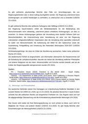 Es gibt zahlreiche glaubwürdige Berichte über Fälle von Verschleppungen, die von Regierungsbehörden oder in deren Auftrag durchgeführt werden. Die Regierung unternimmt keine Anstrengungen, um solche Handlungen zu verhindern, zu untersuchen und zu bestrafen (USDOS 23.4.2024). Es gibt zahlreiche Berichte über politische Gefangene oder Häftlinge (USDOS 23.4.2024). Die Regierung Saudi-Arabiens erfüllt die Mindeststandards für die Bekämpfung des Menschenhandels nicht vollständig, unternimmt jedoch erhebliche Anstrengungen, um dies zu erreichen. Zu diesen Anstrengungen gehören die Verurteilung einer deutlich höheren Zahl von Menschenhändlern, die Unterzeichnung einer Vereinbarung mit einer von der Regierung unterstützten zivilgesellschaftlichen Organisation über die Verwaltung einer speziellen Unterkunft für Opfer von Menschenhandel, die Aufstockung der Mittel für den Opferschutz sowie die Ausarbeitung, Fertigstellung und Umsetzung des Nationalen Aktionsplans 2024-2027 (USDOS 24.6.2024). Nichtstaatsangehörige, die etwa ein Drittel der Bevölkerung ausmachen, haben keine politischen Rechte (FH 2024). Die akademische Freiheit ist eingeschränkt, und Informanten überwachen die Klassenzimmer auf die Einhaltung der Lehrplanvorschriften, darunter ein Verbot der Vermittlung weltlicher Philosophie und anderer Religionen als des Islam. Wissenschaftler und Forscher wurden bestraft, weil sie als Kritiker der Regierungspolitik wahrgenommen wurden (FH 2024). Quellen: - FH – Freedom House (2024): Freedom in the World 2024 - Saudi Arabia, https://www.ecoi.net/de/dokument/2108065.html; Zugriff 22.4.2025 - USDOS – US Department of State [USA] (24.6.2024): 2024 Trafficking in Persons Report: Saudi Arabia, https://www.ecoi.net/de/dokument/2111752.html, Zugriff 18.4.2025 - USDOS – US Department of State [USA] (23.4.2024): 2023 Country Report on Human Rights Practices: Saudi Arabia, https://www.ecoi.net/de/dokument/2107728.html, Zugriff 17.4.2025 11. Meinungs- und Pressefreiheit Die saudischen Behörden setzen ihre Kampagne zur Unterdrückung friedlicher Aktivitäten in den sozialen Medien fort (HRW 16.1.2025; vgl. AI 24.4.2024). Die absolute Monarchie in Saudi-Arabien schränkt fast alle politischen Rechte und bürgerlichen Freiheiten ein. Das Regime stützt sich auf die allgegenwärtige Überwachung und die Kriminalisierung abweichender Meinungen (FH 2024). Das Gesetz sieht weder die freie Meinungsäußerung vor noch schützt es diese, auch nicht für Mitglieder der Presse und anderer Medien (USDOS 23.4.2024). Es gibt häufig Berichte über Einschränkungen der Meinungsfreiheit (USDOS 23.4.2024). .BFA Bundesamt für Fremdenwesen und Asyl Seite 17 von 42