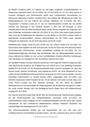 All People's Congress (APC) in Freetown vor, die gegen angebliche Unregelmäßigkeiten im Wahlprozess protestiert haben (AI 24.4.2024; vgl. FH 25.4.2024). Am 13. Juni 2023 wurden in Freetown mindestens acht Demonstranten wegen einer "rechtswidrigen Demonstration zur Störung des öffentlichen Friedens" festgenommen. Sie forderten die Offenlegung der Daten der Wählerregistrierung und den Rücktritt des obersten Wahlleiters (AI 24.4.2024). Das APC- Hauptquartier in Freetown wurde am 25. Juni von Sicherheitskräften umstellt, die mit scharfer Munition und Tränengas in das Gebäude feuerten, in dem sich APC-Anhänger zu einer Pressekonferenz nach der Wahl versammelt hatten, auf der Kamara angeblich die Prognosen über seine Niederlage zurückweisen wollte (FH 25.4.2024; AI 24.4.2024). Eine andere Quelle berichtet, dass es bei den Kundgebungen der Opposition vor den Wahlen im Juni 2023 in einigen Fällen zu gewaltsamen Zusammenstößen zwischen Demonstranten und der Polizei sowie zwischen Anhängern der Opposition und der SLPP gekommen ist (FH 25.4.2024). Medienberichten zufolge wurde bei dem Vorfall eine Frau schwer verletzt (FH 25.4.2024). Ein Demonstrant starb angeblich an einer Schusswunde, für die die Polizei die Verantwortung bestritt. Sechsundsechzig Demonstranten wurden anschließend verhaftet (AI 24.4.2024). Die EU- Wahlbeobachtungsgruppe berichtete, dass die Behörden über die verfassungsmäßigen Grenzen hinaus während der Wahlen im Juni und der anschließenden Proteste willkürliche Verhaftungen und Festnahmen von Anhänger der APC durchführten (USDOS 23.4.2024). Der gewählte Präsident und das Parlament bestimmen in der Regel die Politik der Regierung, aber mehr Macht hat die Exekutive. Der Präsident wird vom Volk für bis zu zwei fünfjährige Amtszeiten gewählt (FH 25.4.2024). Für die Präsidentschaftswahl traten dreizehn Kandidaten an, doch das Rennen wurde zwischen Amtsinhaber Julius Maada Bio (SLPP), der seine Wiederwahl für eine zweite und letzte fünfjährige Amtszeit gemäß der Verfassung von Sierra Leone anstrebte, und dem ehemaligen Außenminister Dr. Samura Kamara (APC), ausgetragen (KAS 10.7.2023). Laut offiziellen Ergebnissen erhielt Präsident Bio 56,2 % der Stimmen und konnte so einen Sieg in der ersten Runde erringen und eine Stichwahl vermeiden. Die APC lehnte die offiziellen Wahlergebnisse ab und beschuldigte die Regierungspartei, die Abstimmung manipuliert zu haben. Bio wurde wenige Stunden nach der Bestätigung seines Sieges durch die Wahlkommission vereidigt (FH 25.4.2024). Der Oberste Gerichtshof hatte Ende Jänner 2023 die Entscheidung der Wahlkommission gebilligt, bei den Parlamentswahlen das Verhältniswahlrecht einzuführen (KAS 10.7.2023). Die Parlamentswahlen finden zeitgleich mit den Präsidentschaftswahlen alle fünf Jahre statt. Sowohl internationale als auch einheimische Wahlbeobachter äußerten Bedenken hinsichtlich der Glaubwürdigkeit der Wahlergebnisse (FH 25.4.2024). Das Einkammerparlament besteht aus 135 Abgeordneten, die vom Volk nach dem Verhältniswahlrecht auf Distriktebene gewählt werden. Vierzehn zusätzliche Sitze sind für indirekt .BFA Bundesamt für Fremdenwesen und Asyl Seite 6 von 29