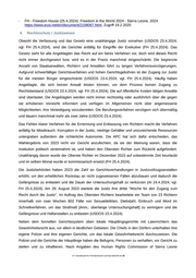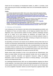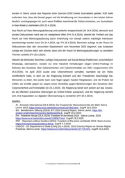 wurden in Sierra Leone laut Reporter ohne Grenzen (RSF) keine Journalisten getötet. RSF stellt außerdem fest, dass die Gewalt gegen und die Inhaftierung von Journalisten in den letzten Jahren deutlich zurückgegangen ist, auch wenn Politiker manchmal die Polizei einsetzen, um Journalisten in ihrer Arbeit zu behindern (FH 25.4.2024). Das Recht auf freie Meinungsäußerung wird weiterhin eingeschränkt (AI 24.4.2024), dennoch sind private Diskussionen nach wie vor weitgehend offen (FH 25.4.2024), obwohl die Freiheit und das Recht auf freie Meinungsäußerung durch Androhung von Gewalt seitens mächtiger Interessen beeinträchtigt werden kann (AI 24.4.2024; vgl. FH 25.4.2024). Berichten zufolge ist der Raum für Diskussionen über den versuchten Staatsstreich vom November 2023 begrenzt, was Analysten zufolge ein Zeichen dafür sein könnte, dass sich der Raum für Meinungsäußerungen zu sensiblen Themen schließt (FH 25.4.2024). Obwohl die Behörden Berichten zufolge Diskussionen auf Social-Media-Plattformen, einschließlich WhatsApp, überwachen, wurden nur eine Handvoll Verhaftungen wegen Online-Postings im Rahmen des Gesetzes über Cybersicherheit und Cyberkriminalität von 2021 vorgenommen (FH 25.4.2024). Im April 2023 wurde eine Unternehmerin verhaftet, nachdem sie ein Video veröffentlicht hatte, in dem sie die Regierung kritisiert und den Präsidenten beschuldigt hat, Menschen zu töten. Sie wurde nach zwei Tagen gegen Kaution freigelassen, und die Polizei hat erklärt, sie ermittle gegen sie wegen eines Verstoßes gegen Bestimmungen des Gesetzes über Cybersicherheit und Kriminalität (AI 24.4.2024). Die Regierung berief sich jedoch auf das Gesetz, als sie öffentlich präventive Warnungen an Online-Kritiker aussprach, und die Regierung bemüht sich, ihre Kapazitäten zur digitalen Überwachung zu verstärken (FH 25.4.2024). Quellen: - AI - Amnesty International (24.4.2024): Der Zustand der Menschenrechte der Welt; Sierra Leone 2023, https://www.ecoi.net/de/document/2107963.html, Zugriff 20.2.2024 - BS - Bertelsmann Stiftung (2024): BTI 2024 Country Report, Sierra Leone, https://bti- project.org/en/reports/country-dashboard/SLE, Zugriff 20.2.2024 - FH - Freedom House (25.4.2024): Freedom in the World 2024 - Sierra Leone, 2024 https://www.ecoi.net/en/document/2108067.html, Zugriff 19.2.2025 - RSF - Reporters without borders (2024): Freedom of the press worldwide 2024, Sierra Leone, https://rsf.org/en/country/sierra-leone, Zugriff 4.3.2025 - USDOS - US Department of State [USA] (23.4.2024): 2023 Country Report on Human Rights Practices, Sierra Leone, https://www.ecoi.net/en/document/2107719.html, Zugriff 19.2.2025 .BFA Bundesamt für Fremdenwesen und Asyl Seite 16 von 29