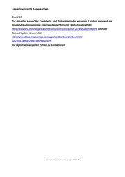 Länderspezifische Anmerkungen Covid-19: Zur aktuellen Anzahl der Krankheits- und Todesfälle in den einzelnen Ländern empfiehlt die Staatendokumentation bei Interesse/Bedarf folgende Websites der WHO: https://www.who.int/emergencies/diseases/novel-coronavirus-2019/situation-reports oder der Johns-Hopkins-Universität: https://gisanddata.maps.arcgis.com/apps/opsdashboard/index.html#/ bda7594740fd40299423467b48e9ecf6 mit täglich aktualisierten Zahlen zu kontaktieren. .BFA Bundesamt für Fremdenwesen und Asyl Seite 3 von 31