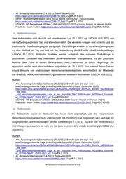 - AI - Amnesty International (7.4.2021): South Sudan 2020, https://www.ecoi.net/de/dokument/2048758.html, Zugriff 26.5.021 - HRW - Human Rights Watch (13.1.2021): World Report 2021 - South Sudan, https://www.ecoi.net/de/dokument/2043727.html, Zugriff 7.7.2021 - USDOS - US Department of State [USA] (30.3.2021): 2020 Country Report on Human Rights Practices: South Sudan, https://www.ecoi.net/en/document/2048131.html, Zugriff 26.5.2021 10. Haftbedingungen Viele Haftanstalten sind überfüllt und unterfinanziert (AA 25.3.2021; vgl. USDOS 30.3.2021) und die Haftbedingungen sind hart und lebensbedrohlich. Die sanitären Anlagen sind schlecht, und die medizinische Grundversorgung ist mangelhaft. Die Häftlinge erhalten in manchen Gefängnissen nur eine Mahlzeit pro Tag und sind von der Unterstützung durch Familie oder Freunde abhängig (USDOS 30.3.2021). Politische Straftäter werden außerhalb des normalen Strafvollzugs in gesonderten Gebäuden des Nationalen Sicherheitsdienstes untergebracht. Es gibt glaubhafte Berichte über Folter in diesen Gefängnissen. Auch Hausarrest ist üblich. Angehörige der Opposition werden auch ohne Verfahren festgehalten (AA 25.3.2021). Das National Prison Service erlaubt Besuche von unabhängigen Menschenrechtsbeobachtern, einschließlich der Mitarbeiter von UNMISS, NGOs, internationalen Organisationen sowie von Journalisten (USDOS 30.3.2021). Quellen: - AA - Auswärtiges Amt [Deutschland] (25.3.2021): Bericht über die asyl- und abschiebungsrelevante Lage in der Republik Südsudan (Stand: Dezember 2020), https://www.ecoi.net/en/file/local/2050124/Ausw%C3%A4rtiges_Amt%2C_Bericht_%C3%Bcber _die_asyl- _und_abschiebungsrelevante_Lage_in_der_Republik_S%C3%Bcdsudan_%28Stand_Dezemb er_2020%29%2C_25.03.2021.pdf, Zugriff 26.5.2021 - USDOS - US Department of State (30.3.2021): 2020 Country Report on Human Rights Practices: South Sudan, https://www.ecoi.net/en/document/2048131.html, Zugriff 26.5.2021 11. Todesstrafe Die Todesstrafe wurde im Südsudan bis heute nicht abgeschafft und die entsprechende Menschenrechtskonvention nicht unterzeichnet (AA 25.3.2021). Die Todesstrafe wird nach wie vor ausgesprochen, und Hinrichtungen werden vollstreckt (AI 7.4.2021). 2019 ist von mindestens 13 Hinrichtungen auszugehen, so viele wie nie zuvor in einem Jahr seit der Unabhängigkeit 2011 (AA 25.3.2021). Quellen: - AA - Auswärtiges Amt [Deutschland] (25.3.2021): Bericht über die asyl- und abschiebungsrelevante Lage in der Republik Südsudan (Stand: Dezember 2020), https://www.ecoi.net/en/file/local/2050124/Ausw%C3%A4rtiges_Amt%2C_Bericht_%C3%Bcber _die_asyl- _und_abschiebungsrelevante_Lage_in_der_Republik_S%C3%Bcdsudan_%28Stand_Dezemb er_2020%29%2C_25.03.2021.pdf, Zugriff 6.5.2021 - AI - Amnesty International (7.4.2021): Südsudan 2020, https://www.ecoi.net/de/dokument/2048821.html, Zugriff 7.5.2021 .BFA Bundesamt für Fremdenwesen und Asyl Seite 16 von 25
