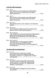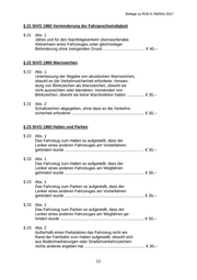 Beilage zu RU6-A-766/041-2017 11 § 21 StVO 1960 Verminderung der Fahrgeschwindigkeit § 21 Abs. 1 Jähes und für den Nachfolgeverkehr überraschendes Abbremsen eines Fahrzeuges unter gleichzeitiger Behinderung ohne zwingenden Grund .......... ............................ € 40,-- § 22 StVO 1960 Warnzeichen § 22 Abs. 1 Unterlassung der Abgabe von akustischen Warnzeichen, obwohl es die Verkehrssic herheit erforderte; Verwen- dung von Blinkzeichen als Warnzeichen, obwohl sie nicht ausreichten oder blendeten; Verwenden von Blinkzeichen, obwohl sie keine Warnf unktion hatten ................ € 30,-- § 22 Abs. 2 Schallzeichen abgegeben, ohne dass es die Verkehrs- sicherheit erforderte ...... ............................................................ € 30,-- § 23 StVO 1960 Halten und Parken § 23 Abs. 1 Das Fahrzeug zum Halten so aufgestellt, dass der Lenker eines anderen Fahr zeuges am Vorbeifahren gehindert wurde ................. ....................................................... € 30,-- § 23 Abs. 1 Das Fahrzeug zum Halten so aufgestellt, dass der Lenker eines anderen Fahrzeuges am Wegfahren gehindert wurde ........................................................................ € 30,-- § 23 Abs. 1 Das Fahrzeug zum Parken so aufgestellt, dass der Lenker eines anderen Fahr zeuges am Vorbeifahren gehindert wurde ................. ....................................................... € 30,-- § 23 Abs. 1 Das Fahrzeug zum Parken so aufgestellt, dass der Lenker eines anderen Fahr zeuges am Wegfahren ge- hindert wurde .......... .................................................................. € 30,-- § 23 Abs. 2 Außerhalb eines Parkplatzes das Fahrzeug nicht am Rand der Fahrbahn zum Halten aufgestellt, obwohl sich aus Bodenmarkierungen oder Straßenverkehrszeichen nichts anderes ergeben hat .... ................................................... € 30,--