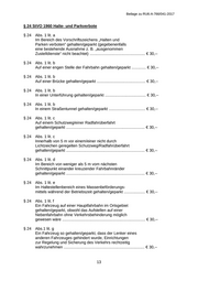 Beilage zu RU6-A-766/041-2017 13 § 24 StVO 1960 Halte- und Parkverbote § 24 Abs. 1 lit. a Im Bereich des Vorschriftszeichens „Halten und Parken verboten“ gehal ten/geparkt (gegebenenfalls eine bestehende Ausnahme z. B. „ausgenommen Zustelldienste“ nicht beachtet) ............ ...................................... € 30,-- § 24 Abs. 1 lit. b Auf einer engen Stelle der Fahrbahn gehalten/geparkt ............. € 30,-- § 24 Abs. 1 lit. b Auf einer Brücke gehalten/geparkt .......... .................................. € 30,-- § 24 Abs. 1 lit. b In einer Unterführung gehalt en/geparkt ..................................... € 30,-- § 24 Abs. 1 lit. b In einem Straßentunnel gehalten/geparkt .. ............................... € 30,-- § 24 Abs. 1 lit. c Auf einem Schutzweg/einer Radfahrüberfahrt gehalten/geparkt ............... ........................................................ € 30,-- § 24 Abs. 1 lit. c Innerhalb von 5 m vor einem/einer nicht durch Lichtzeichen geregelten Schutzweg/Radfahrüberfahrt gehalten/geparkt ............... ........................................................ € 30,-- § 24 Abs. 1 lit. d Im Bereich von weniger als 5 m vom nächsten Schnittpunkt einander kreuzender Fahrbahnränder gehalten/geparkt ............... ........................................................ € 30,-- § 24 Abs. 1 lit. e Im Haltestellenbereich eines Massenbeförderungs- mittels während der Betriebszeit gehalt en/geparkt ................... € 30,-- § 24 Abs. 1 lit. f Ein Fahrzeug auf einer Hauptfahrbahn im Ortsgebiet gehalten/geparkt, obwohl das Aufstellen auf einer Nebenfahrbahn ohne Verkehrsb ehinderung möglich gewesen wäre ....... .................................................................... € 30,-- § 24 Abs.1 lit. g Ein Fahrzeug so gehalten/gepar kt, dass der Lenker eines anderen Fahrzeuges gehind ert wurde, Einrichtungen zur Regelung und Sicherung des Verkehrs rechtzeitig wahrzunehmen ............... .......................................................... € 30,--