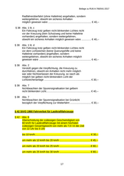Beilage zu RU6-A-766/041-2017 17 Radfahrerüberfahr t (ohne Haltelinie) angehalten, sondern weitergefahren, obwohl ein sicheres Anhalten möglich gewesen wäre ....... ....................................................... € 40,-- § 38 Abs. 1 lit. c Ein Fahrzeug trotz gelben nich t blinkenden Lichtes nicht vor der Kreuzung (kein Sc hutzweg und keine Haltelinie vorhanden) angehalten, s ondern weitergefahren, obwohl ein sicheres A nhalten möglich gewesen wäre .............. € 40,-- § 38 Abs. 1 lit. d Ein Fahrzeug trotz gelben nich t blinkenden Lichtes nicht vor dem Lichtzeichen (k eine Querungshilfe und keine Haltelinie vor handen) angehalten, sondern weitergefahren, obwohl ein sicheres Anhalten möglich gewesen wäre ....... .................................................................... € 40,-- § 38 Abs. 2 Verstoß gegen die Verpflichtung, die Kreuzung zu durchfahren, obwohl ein Anha lten nicht mehr möglich war oder Nichtverlassen der Kreuzung, so rasch als möglich bei gelben nicht blinkendem Licht der Lichtzeichenanlage ............ ....................................................... € 30,-- § 38 Abs. 7 Nichtbeachten der Spurensignalisation bei gelbem nicht blinkenden Licht........... ..................................................... € 40,-- § 38 Abs. 7 Nichtbeachten der Spurensi gnalisation bei Grünlicht bezüglich der Verpflichtung zur Weiterf ahrt .............................. € 30,-- § 42 StVO 1960 Fahrverbot für Lastkraftfahrzeuge § 42 Abs. 8 Überschreitung der zulässigen Geschwindigkeit von 60 km/h für Lastkraftfahrzeuge mit einem höchsten zulässigen Gesamtgewicht von mehr als 7,5 t in der Zeit von 22 Uhr bis 5 Uhr bis 10 km/h................................................................................ € 30,-- um mehr als 10 km/h bis 20 km/h ............................................ € 45,-- um mehr als 20 km/h bis 25 km/h .............................................€ 60,-- um mehr als 25 km/h bis 30 km/h ............................................ € 80,--